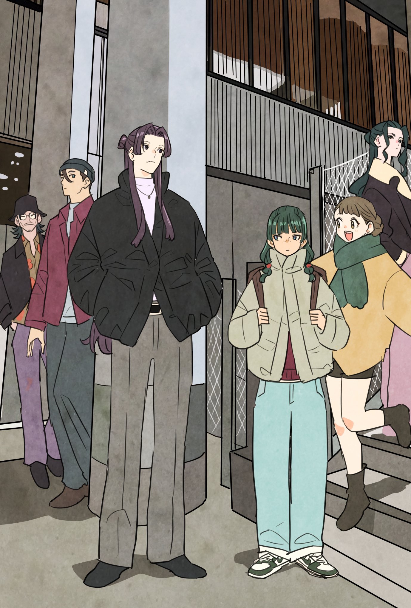 3boys 3girls bag belt brown_hair closed_mouth coat commentary_request father_and_child father_and_daughter freckles full_body gaoshun_(kusuriya_no_hitorigoto) glasses green_hair grey_pants hair_between_eyes half_updo hands_in_pockets hat highres jinshi_(kusuriya_no_hitorigoto) kusuriya_no_hitorigoto lakan_(kusuriya_no_hitorigoto) long_hair maomao_(kusuriya_no_hitorigoto) multiple_boys multiple_girls open_mouth pants parent_and_child purple_hair purple_pants purple_shirt scarf shirt shoes shoulder_bag sidelocks smile sneakers standing standing_on_one_leg suirei_(kusuriya_no_hitorigoto) takeuchi_ryousuke twintails wavy_hair xiaolan_(kusuriya_no_hitorigoto)