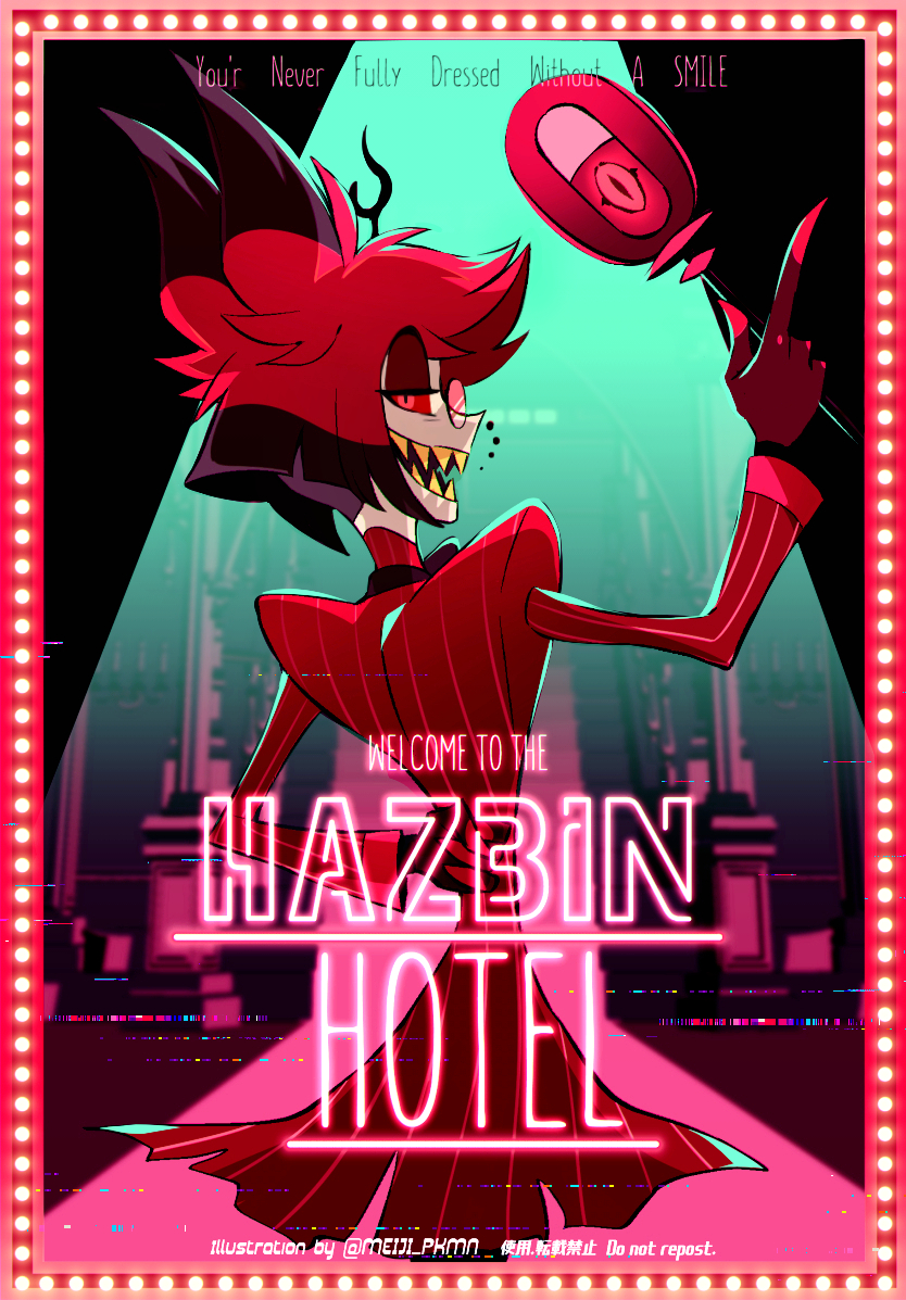 1boy alastor_(hazbin_hotel) animal_ears antlers arm_behind_back arm_up black_bow black_bowtie black_hair bow bowtie cane coat colored_sclera colored_skin colored_teeth commentary_request copyright_name cowboy_shot deer_antlers deer_ears english_text eyeshadow facing_back from_behind glitch hazbin_hotel hellaverse holding holding_cane horns makeup male_focus meiji_ken monocle multicolored_hair pale_skin red_coat red_eyes red_eyeshadow red_hair red_sclera sharp_teeth solo striped_coat teeth twitter_username two-tone_hair yellow_teeth
