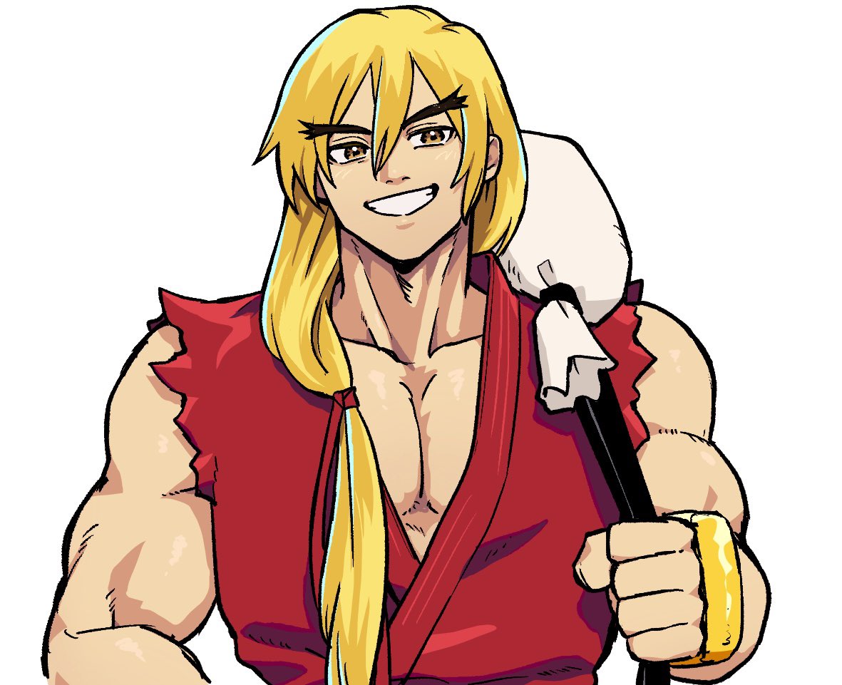 1boy bag bare_shoulders blonde_hair brown_eyes collarbone commentary dougi fingerless_gloves gloves grin holding holding_bag ken_masters long_hair low_ponytail male_focus matapon_(popoponex) pectoral_cleavage pectorals ponytail red_shirt shirt shoulder_bag sleeveless smile solo street_fighter street_fighter_zero_(series) teeth thick_eyebrows torn_clothes torn_sleeves upper_body yellow_gloves