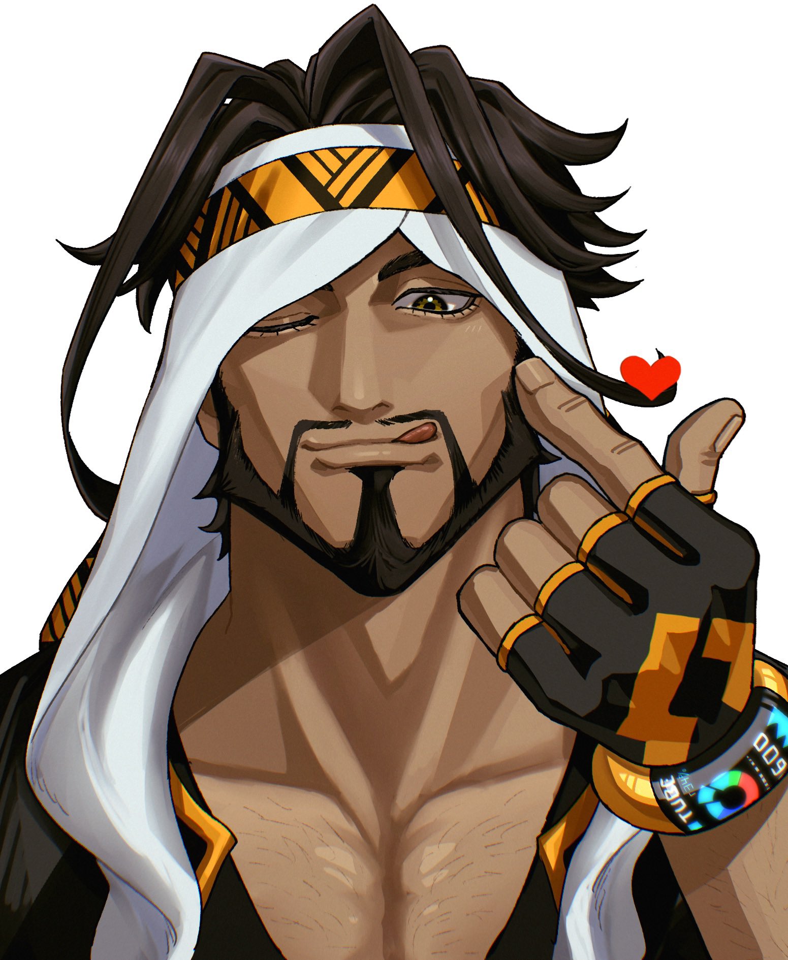 1boy arabian_clothes arm_up beard black_shirt bracelet brown_eyes brown_hair closed_mouth collarbone collared_shirt dark-skinned_male dark_skin facial_hair fingerless_gloves gloves goatee hat headband heart highres index_finger_raised jewelry licking_lips looking_ahead male_focus matapon_(popoponex) multicolored_gloves one_eye_closed orange_trim parted_bangs patterned_clothing pectoral_cleavage pectorals rashid_(street_fighter) shirt simple_background smile solo street_fighter street_fighter_6 tongue tongue_out turban upper_body white_background white_turban