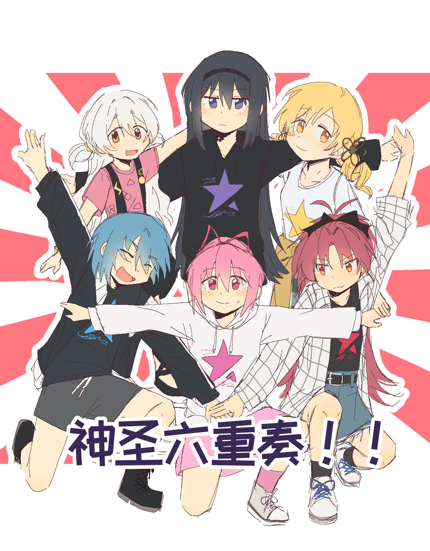6+girls :d ^_^ akemi_homura alternate_costume arm_up belt black_footwear black_hair black_hairband black_hoodie black_ribbon black_shirt black_shorts black_socks blonde_hair blue_eyes blue_hair blue_skirt boots casual chinese_commentary chinese_text closed_eyes closed_mouth clothes_writing collared_shirt commentary_request denim dot_nose drill_hair expressionless facing_viewer fang frown full_body hair_between_eyes hair_ornament hair_ribbon hairband happy highres hood hood_down hoodie jacket jitome kaname_madoka kneeling light_smile long_hair long_sleeves looking_at_another looking_at_viewer mahou_shoujo_madoka_magica mahou_shoujo_madoka_magica:_hangyaku_no_monogatari mahou_shoujo_madoka_magica_(anime) miki_sayaka momoe_nagisa multiple_girls on_one_knee open_mouth orange_eyes outline outstretched_arms overalls pink_eyes pink_hair pink_shirt pink_skirt pink_socks plaid_clothes plaid_shirt polka_dot ponytail purple_eyes red_background red_eyes red_hair ribbon sakura_kyoko shirt shoes short_hair short_sleeves short_twintails shorts skirt smile sneakers socks sorghum39919263 standing star_(symbol) star_print suspender_shorts suspender_skirt suspenders sweatdrop sweater t-shirt tomoe_mami translation_request twin_drills twintails two-tone_background two_side_up white_background white_footwear white_hair white_hoodie white_outline white_shirt yellow_eyes yellow_skirt