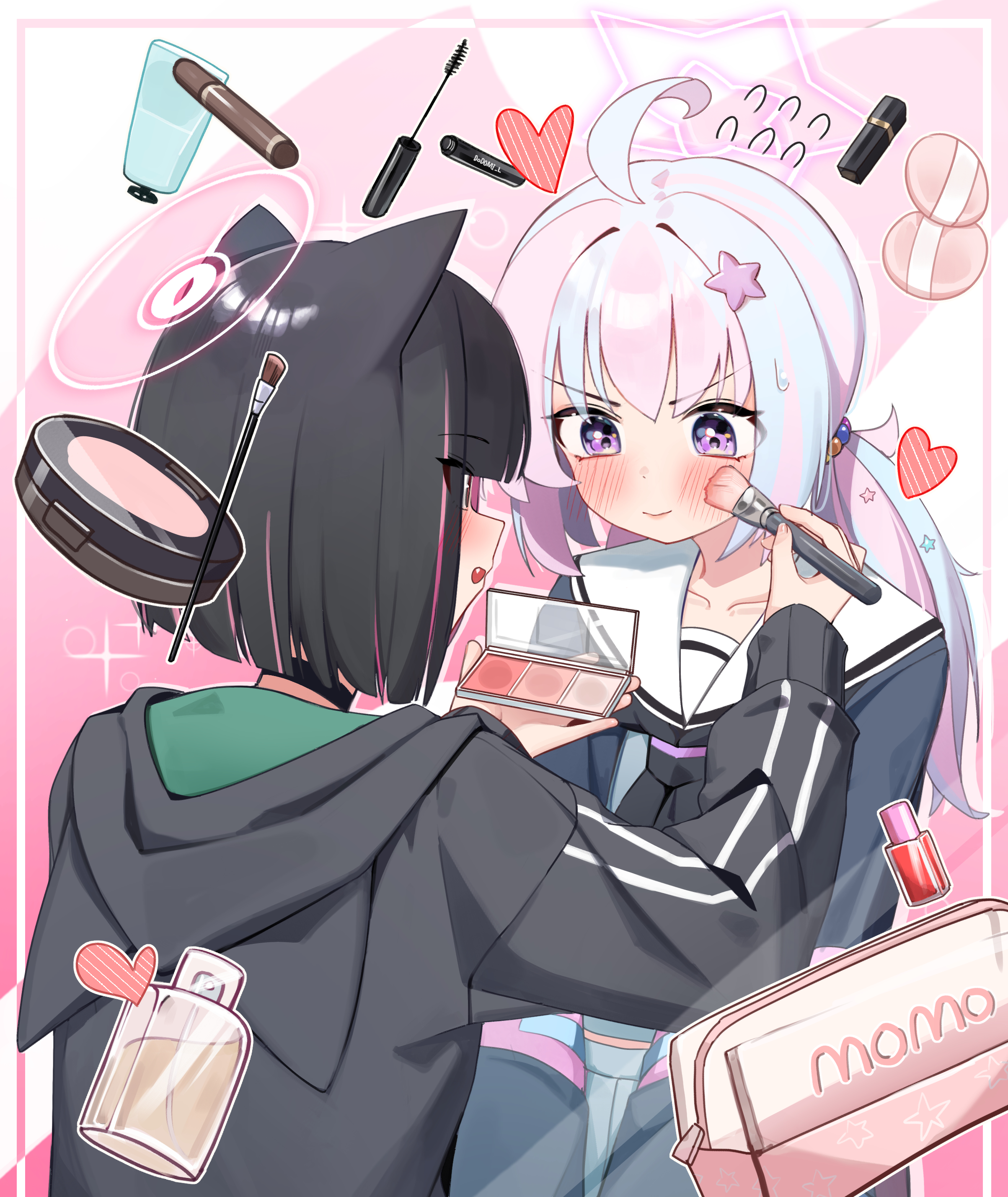 2girls absurdres ahoge animal_ears applying_makeup black_choker black_hair black_jacket blue_archive blue_hair blush cat_ears choker closed_mouth cosmetics flying_sweatdrops hair_ornament halo heart highres holding holding_brush hood hood_down hooded_jacket jacket kazusa_(blue_archive) lipstick_tube long_hair long_sleeves makeup makeup_brush makeup_palette mascara_wand multicolored_hair multiple_girls open_mouth pink_hair pink_halo purple_eyes reisa_(blue_archive) rouge_(makeup) short_hair smile star_(symbol) star_hair_ornament two-tone_hair whonyang