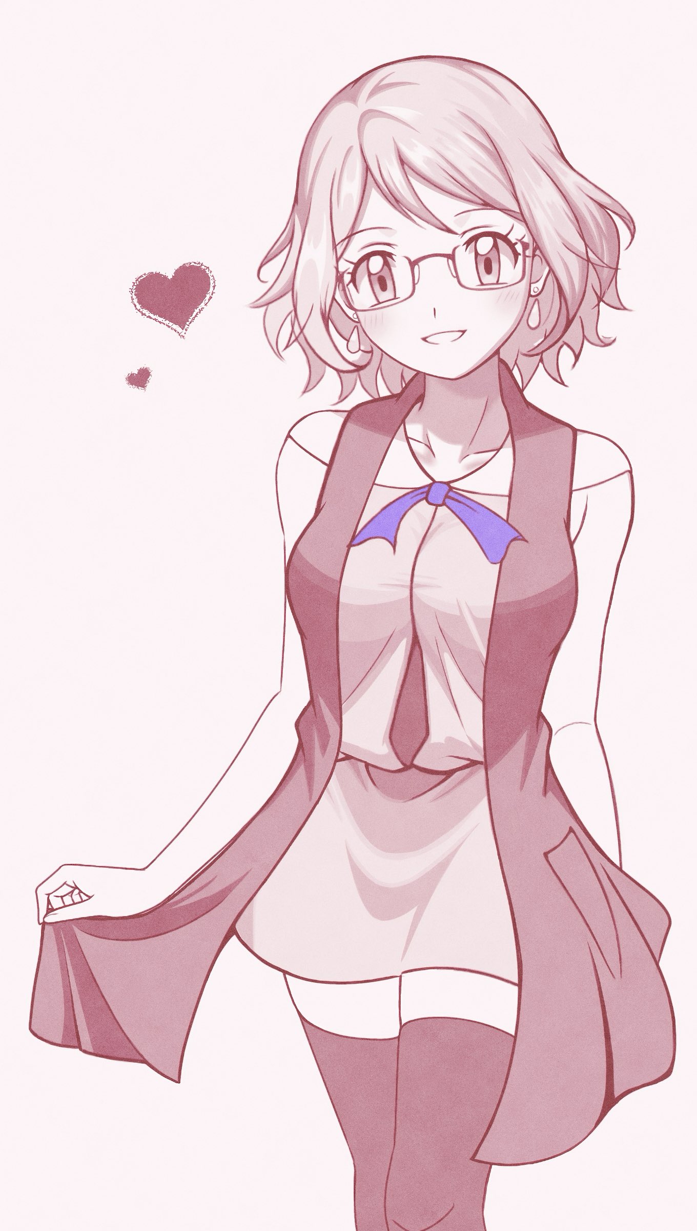 1girl absurdres blue_ribbon breasts earrings glasses heart highres jewelry looking_at_viewer nintendo open_clothes open_mouth pokemon pokemon_(anime) pokemon_the_series:_xy ribbon serena_(pokemon) shirt short_hair skirt sleeveless sleeveless_shirt smile solo thighhighs zeki231