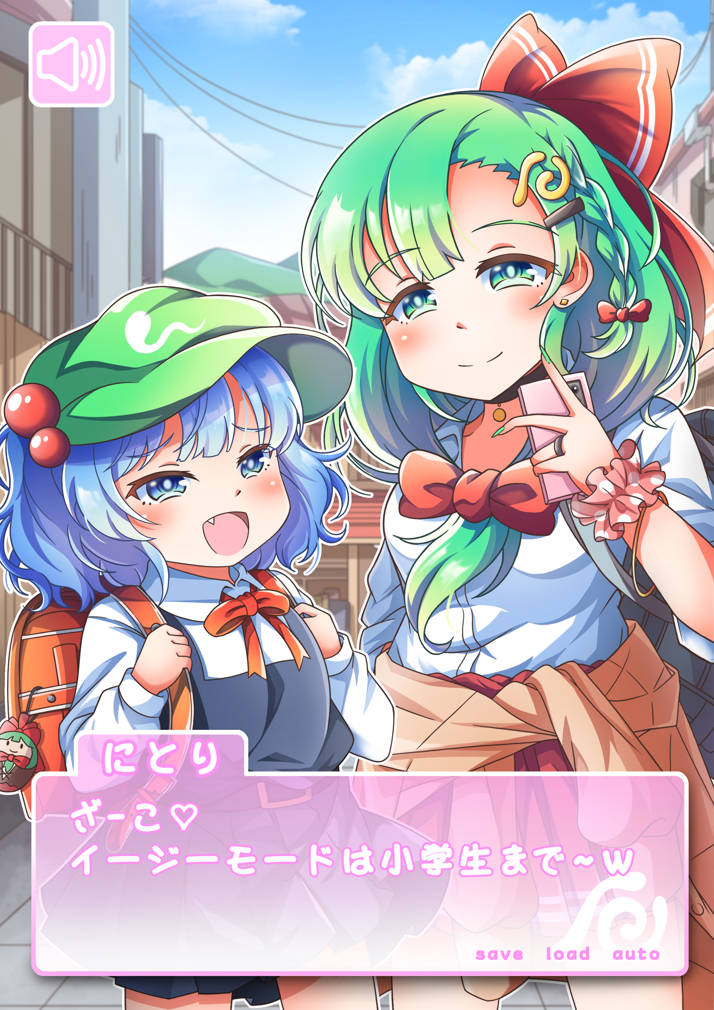 2girls absurdres blue_eyes blue_hair fang front_ponytail hayo_(qudtjr4682) highres kagiyama_hina kawashiro_nitori looking_at_viewer multiple_girls open_mouth shirt smile touhou two_side_up video_game_dialogue_box white_shirt