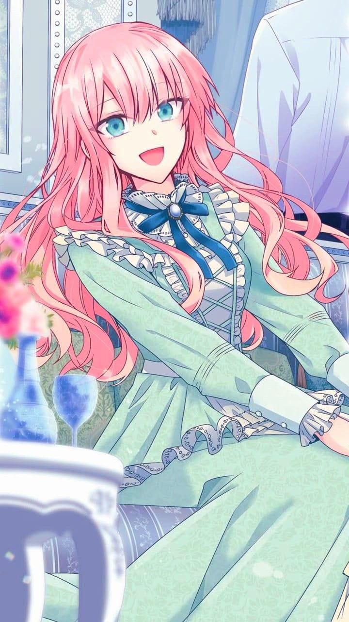 1girl artist_request breasts copyright_notice dress frilled_dress frills green_dress green_eyes highres long_hair loop_7-kaime_no_akuyaku_reijou_wa_moto_tekikoku_de_jiyuu_kimama_na_hanayome_seikatsu_wo_mankitsu_suru pink_hair rishe_irmgard_weitzner smile solo_focus very_long_hair wavy_hair