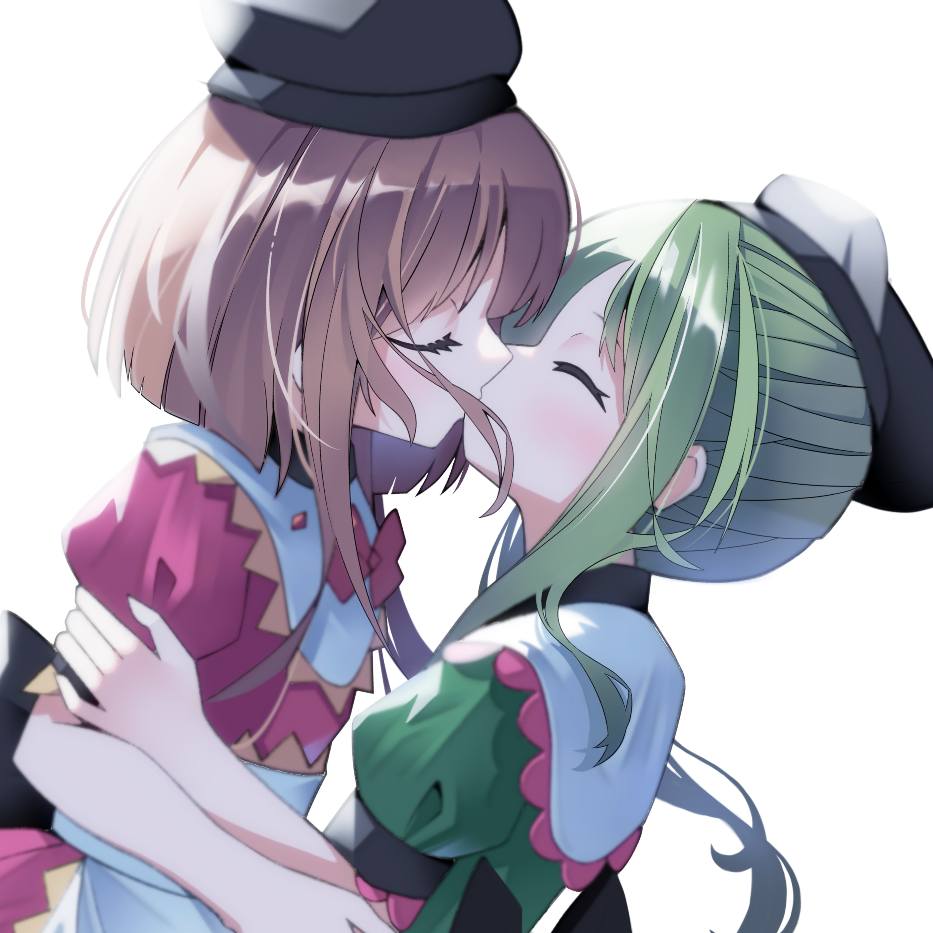 2girls absurdres black_hat brown_hair closed_eyes commentary_request dress green_dress green_hair hat highres kiss multiple_girls nishida_satono pink_dress puffy_short_sleeves puffy_sleeves shishidonagi short_hair short_hair_with_long_locks short_sleeves simple_background tate_eboshi teireida_mai touhou upper_body white_background yuri
