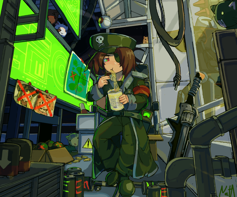 1boy battery black_coat black_hat black_pants bomb cable cat coat instant_cup_noodles epic_battle_fantasy explosive eyepatch factory gunblade hat indoors instant_noodles lance_(epic_battle_fantasy) long_sleeves map matt_(epic_battle_fantasy) military_hat military_uniform monster_energy natalie_(epic_battle_fantasy) nato(nat_a) nissin_cup_noodle pants paper solo weapon