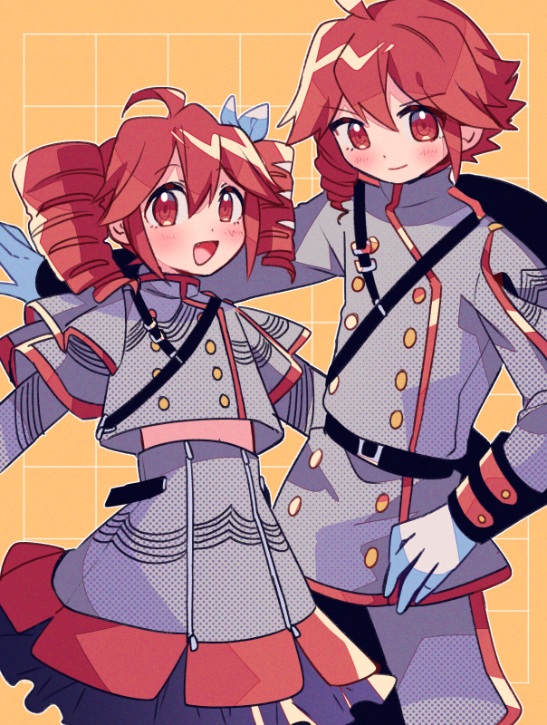 1boy 1girl ahoge arm_up blush bow buttons closed_mouth cowboy_shot double-breasted double-parted_bangs drill_hair genderswap genderswap_(ftm) gloves grey_jacket grey_pants grey_skirt hair_between_eyes hair_bow hair_ribbon hand_on_own_hip jacket kasane_ted kasane_teto kasane_teto_(sv) layered_skirt long_sleeves looking_at_viewer midriff_peek open_mouth pants red_eyes red_hair red_trim ribbon shoulder_belt skirt skirt_set sleeve_cuffs striped_background striped_clothes striped_jacket striped_skirt synthesizer_v tongue twin_drills utau white_bow white_gloves white_ribbon yellow_background yuusuke-kun