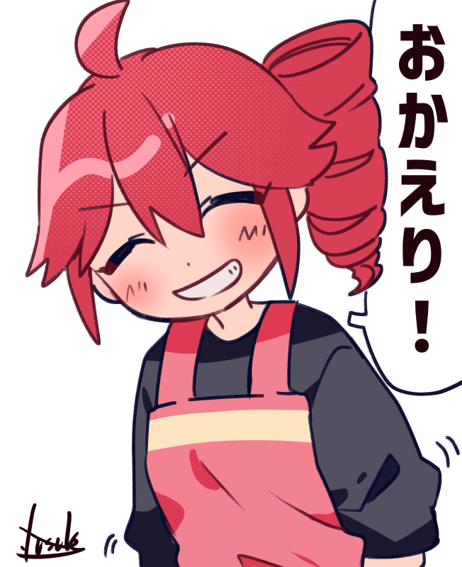 1girl ahoge apron black_shirt blush close-up closed_eyes double-parted_bangs drill_hair grin hair_between_eyes kasane_teto red_apron red_hair shirt short_sleeves side_drill signature simple_background smile solo translation_request utau white_background yuusuke-kun