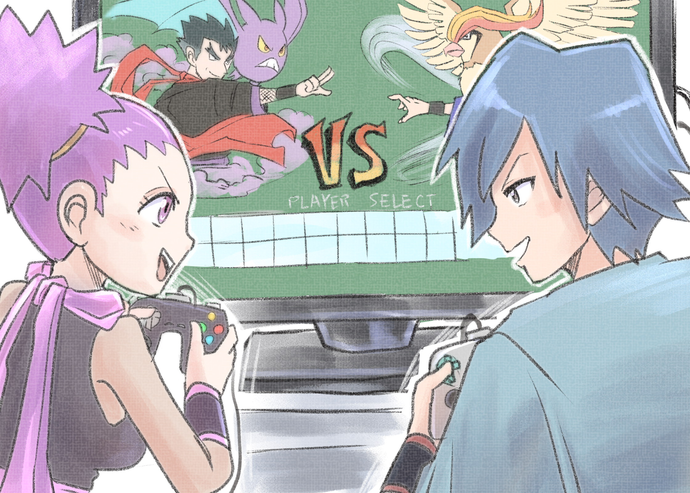 1boy 1girl bat_wings blue_hair controller crobat falkner_(pokemon) game_controller gen_1_pokemon gen_2_pokemon highres holding holding_controller holding_game_controller janine_(pokemon) koga_(pokemon) looking_at_another makita_(mugitya3776) nintendo pidgeot pokemon pokemon_heartgold_and_soulsilver purple_eyes purple_hair purple_scarf scarf television vs wings