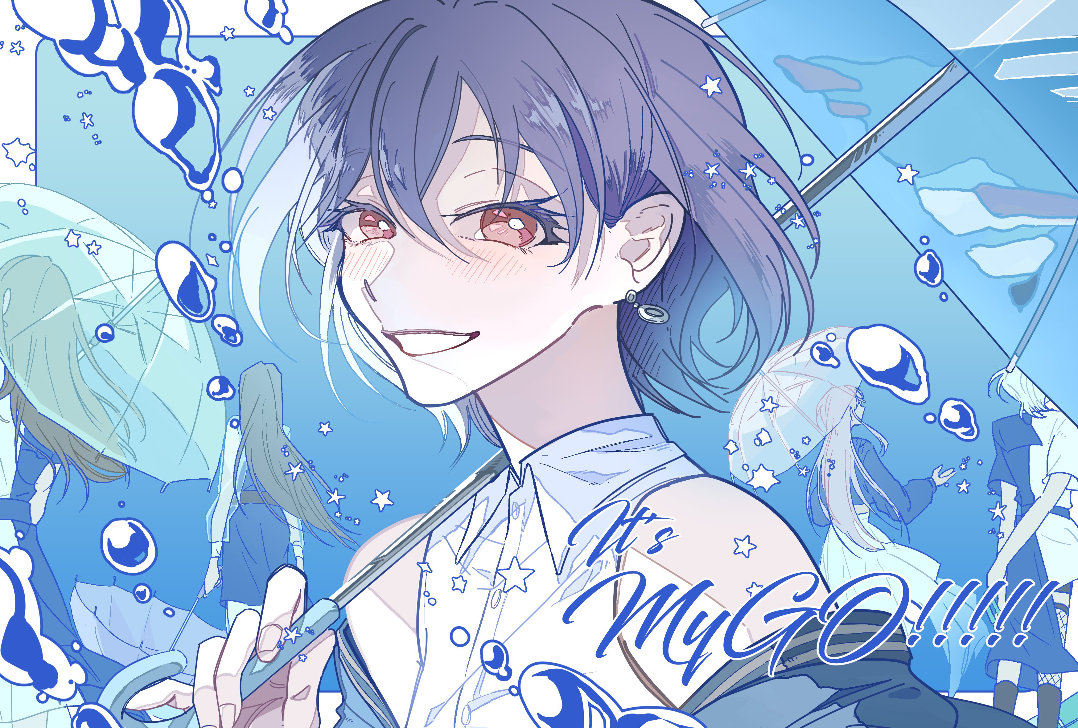 5girls a_t_y_k absurdres arms_behind_back bang_dream! bang_dream!_it's_mygo!!!!! black_footwear black_hair black_shorts blue_dress blue_jacket blue_theme blush boots brown_eyes brown_hair bubble chihaya_anon collared_shirt commentary_request copyright_name cropped_jacket dress dress_shirt earrings fishnet_thighhighs fishnets floating_hair grey_hair hand_up highres holding holding_umbrella jacket jewelry kaname_raana korean_commentary long_hair looking_at_viewer multiple_girls mygo!!!!!_(bang_dream!) nagasaki_soyo off_shoulder open_mouth own_hands_together pink_hair pleated_skirt shiina_taki shirt short_hair shorts single_thighhigh skirt sleeveless sleeveless_shirt takamatsu_tomori thighhighs umbrella white_hair white_shirt white_skirt
