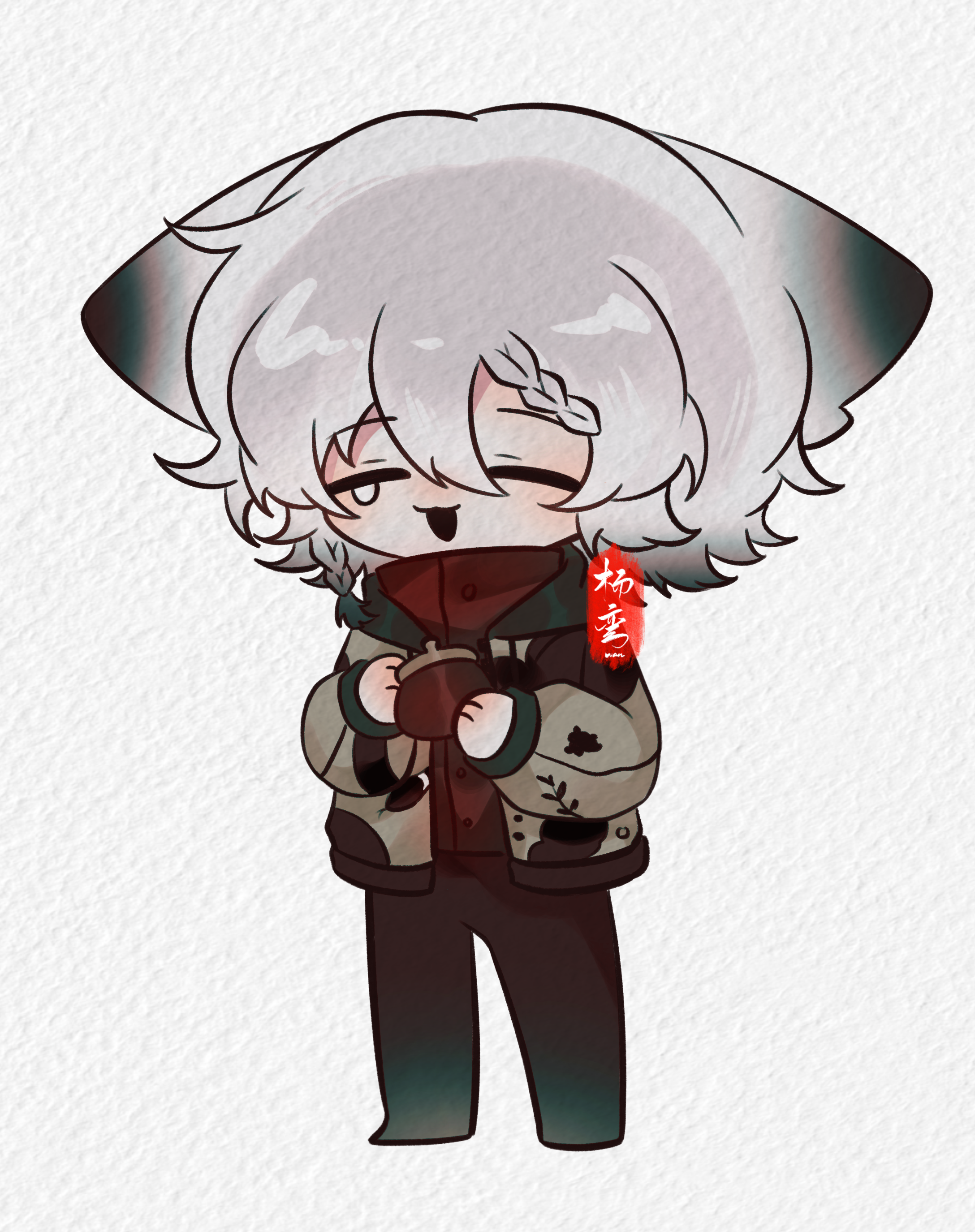1boy absurdres animal_ears bag black_hair black_pants braid braided_bangs chinese_commentary closed_eyes coin_purse commentary_request deformed fox_boy fox_ears gradient_hair grey_jacket hair_between_eyes highres holding holding_bag jacket limingyigong long_sleeves male_focus medium_hair multicolored_hair open_clothes open_jacket open_mouth pants red_shirt shasha_(touqi_guaitan) shirt smile solo teardrop touqi_guaitan white_hair