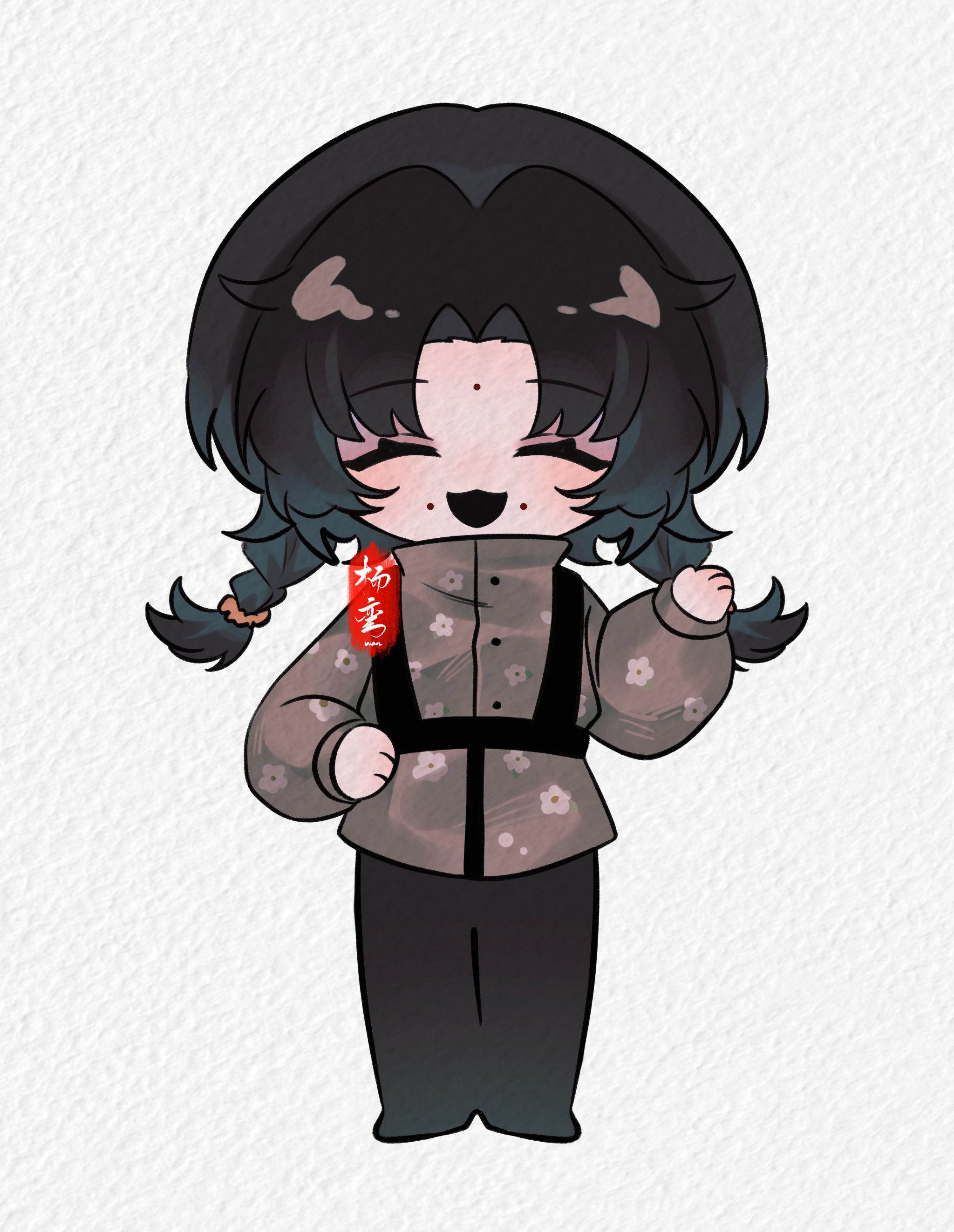 1girl :3 absurdres black_hair black_shoes braid chest_harness chinese_commentary closed_eyes commentary_request curtained_hair deformed facing_viewer floral_print grey_shirt hand_on_own_hip hand_up harness highres limingyigong mole mole_on_cheek mole_on_forehead multiple_moles open_mouth parted_bangs print_shirt shirt shoes simple_background smile solo touqi_guaitan twin_braids white_background wu_jiahui