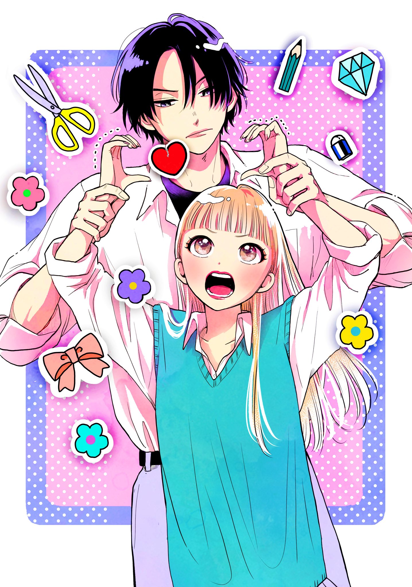 1boy 1girl aqua_sweater_vest arms_up bow bowtie closed_mouth collared_shirt commentary_request diamond_(gemstone) eraser facing_viewer fingernails flower futarijime_romantic hands_up heart heart_hands highres holding_another's_wrist kanisawa_chihiro kumamori_kokomi lipstick long_hair long_sleeves makeup nail_polish open_mouth pencil pink_bow pink_bowtie pink_flower purple_eyes purple_flower purple_hair scissors shirt short_hair sleeves_rolled_up sweater_vest tajima_kyouhei teeth white_shirt yellow_flower