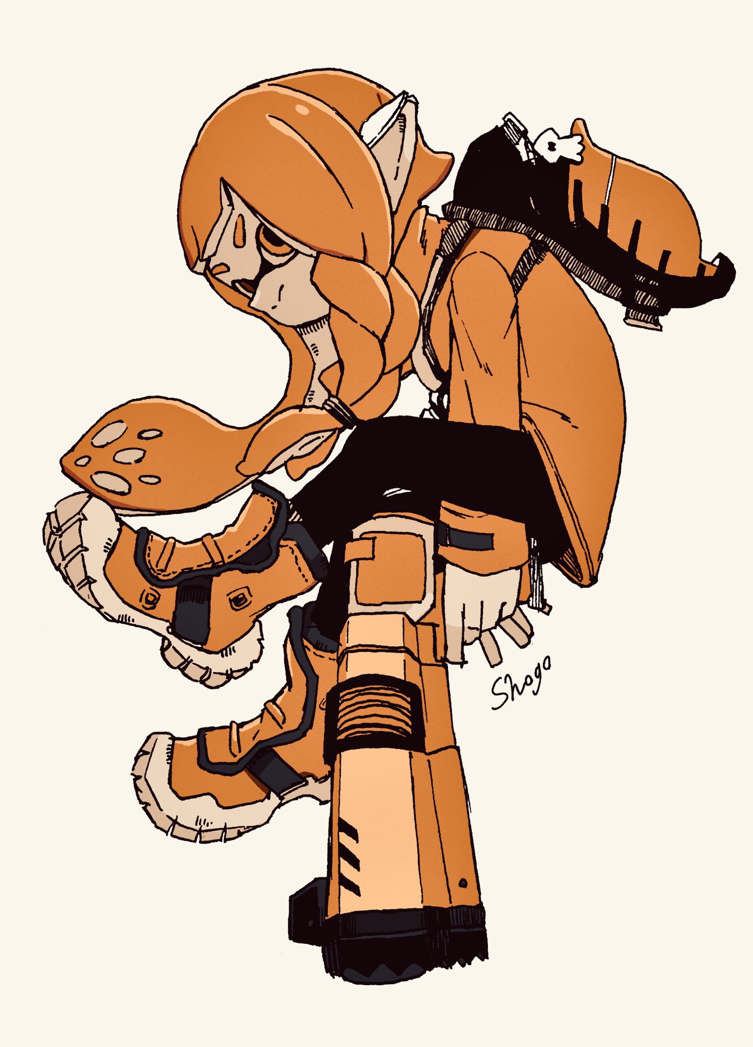 1girl agent_3_(splatoon_3) arm_between_legs artist_name asymmetrical_hair black_pants braid brown_eyes charm_(object) closed_mouth commentary_request full_body hero_shot_(splatoon_3) heterochromia highres holding holding_weapon ink_tank_(splatoon) inkling inkling_girl inkling_player_character jacket long_hair long_sleeves nintendo orange_eyes orange_hair orange_jacket orange_shoes pants pointy_ears shoes shogo_(shogo70449442) simple_background single_braid solo splatoon_(series) splatoon_3 tentacle_hair weapon white_background