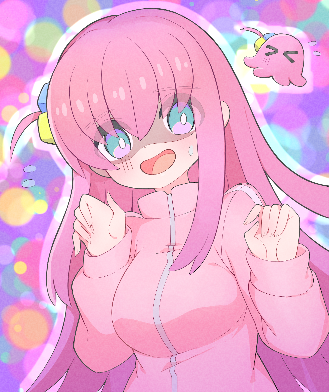 1girl blue_eyes blush bocchi_the_rock! chinese_commentary commentary_request cropped_torso cube_hair_ornament dot_nose dual_persona gotoh_hitori gotoh_hitori_(octopus) hair_between_eyes hair_ornament highres jacket long_hair nishitin octopus one_side_up open_mouth pink_hair pink_jacket sidelocks solo_focus straight_hair track_jacket turtleneck turtleneck_jacket very_long_hair zipper