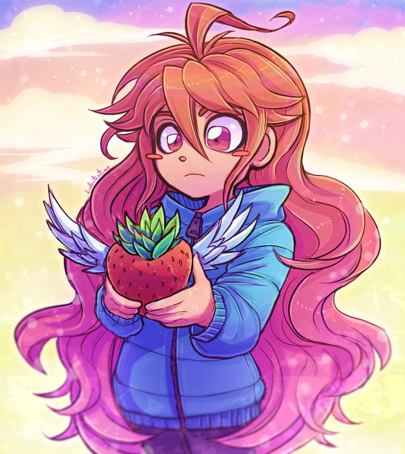1girl ahoge backpack bag blue_jacket celeste_(game) coat food fruit jacket linterteatime long_hair long_sleeves madeline_(celeste) orange_hair pants red_eyes red_hair solo strawberry upper_body winter_clothes winter_coat