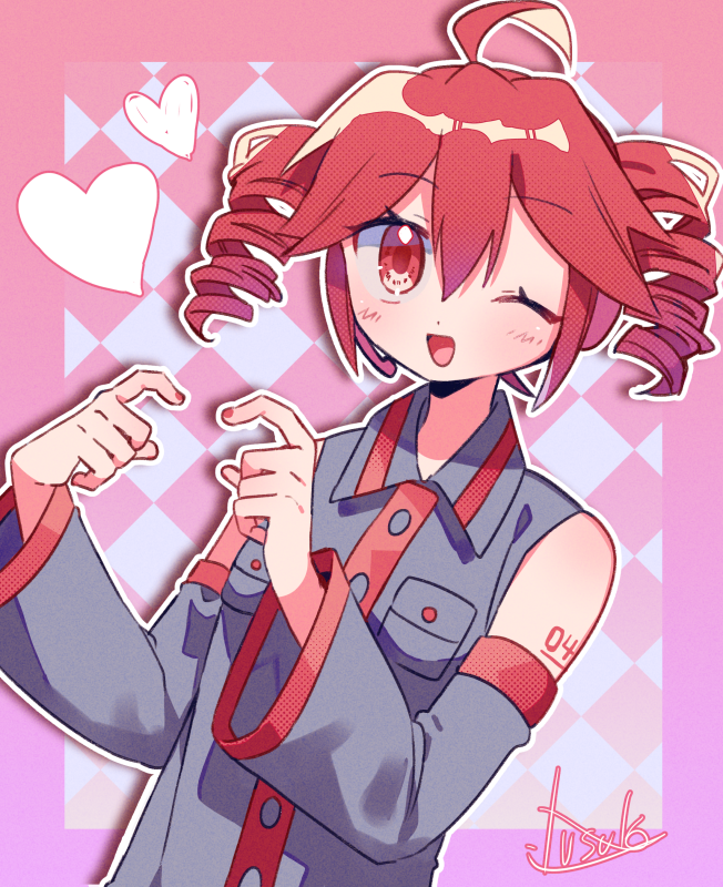 1girl ahoge black_shirt black_sleeves blush buttons collared_shirt detached_sleeves double-parted_bangs drill_hair fingernails hair_between_eyes heart kasane_teto kasane_teto_(utau) long_sleeves one_eye_closed open_mouth pink_background red_eyes red_hair red_nails red_trim shirt signature sleeveless sleeveless_shirt solo tongue twin_drills upper_body utau wing_collar yuusuke-kun