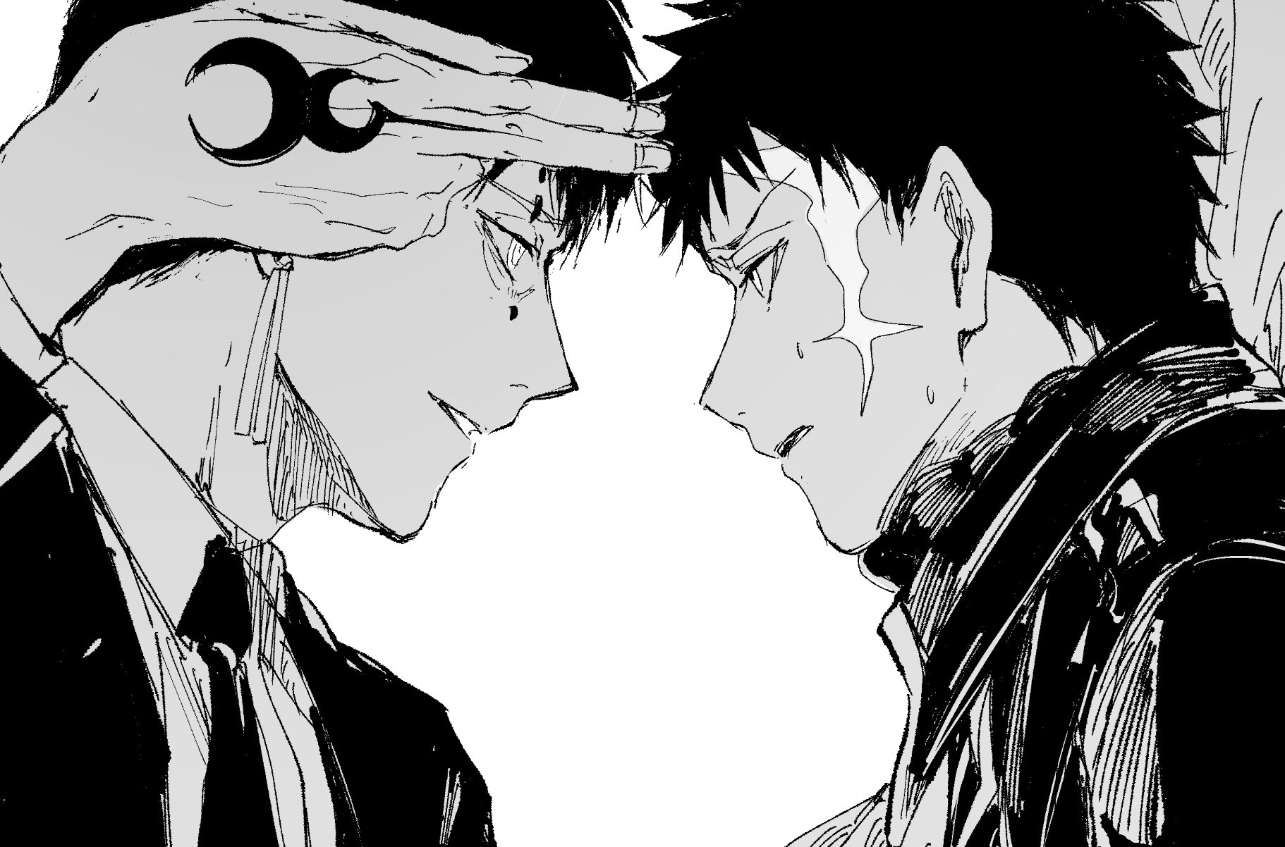 21g_yaseru 2boys collared_shirt double_finger_gun earrings eye_contact faceoff facial_mark finger_gun finger_gun_to_head fingernails formal_clothes from_side greyscale highres jacket jewelry kagurabachi long_sleeves looking_at_another male_focus mark_under_eye monochrome multiple_boys necktie parted_lips pointing pointing_at_another portrait profile rokuhira_chihiro scar scar_on_face shirt short_hair simple_background suit sweat sweater teeth turtleneck turtleneck_sweater white_background yura_(kagurabachi)