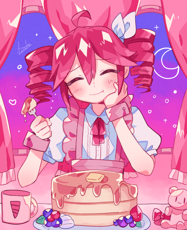 1girl ahoge blush bow butter close-up closed_eyes closed_mouth collared_shirt cup curtains double-parted_bangs drill_hair eating_hair food fork fruit hair_between_eyes hair_bow hand_on_own_cheek hand_on_own_face hands_up heart holding holding_fork indoors kasane_teto kasane_teto_(sv) moon mug neck_ribbon pancake pancake_stack pink_wrist_cuffs purple_sky red_hair red_ribbon ribbon shirt sky smile solo star_(sky) strawberry stuffed_toy suspenders synthesizer_v syrup table twin_drills utau white_bow white_shirt window wing_collar wrist_cuffs yuusuke-kun