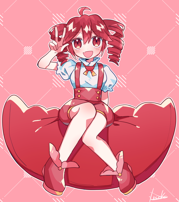 1girl ahoge blush collared_shirt double-parted_bangs drill_hair fang frilled_sleeves frills fusion hair_between_eyes kasane_teto open_mouth pink_background red_footwear red_hair red_shorts shirt short_sleeves shorts signature sitting skin_fang smile suspender_shorts suspenders twin_drills utau voiceroid voicevox w white_shirt yuusuke-kun zundamon