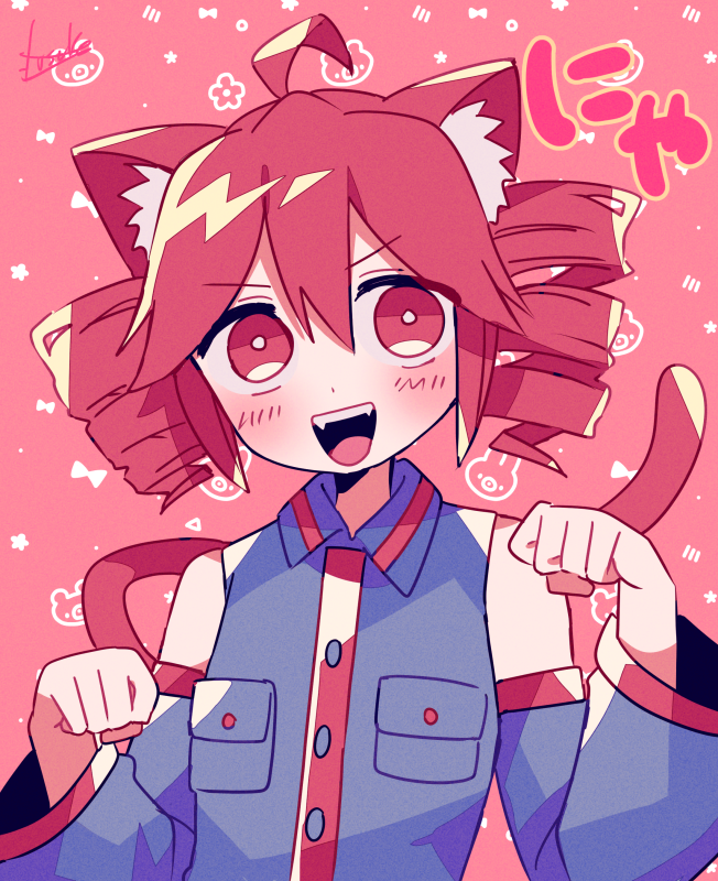 1girl ahoge animal_ears black_shirt blush buttons cat_ears close-up collared_shirt detached_sleeves double-parted_bangs drill_hair fangs hair_between_eyes kasane_teto kasane_teto_(utau) long_sleeves open_mouth paw_pose pink_background pocket red_eyes red_hair red_trim shirt signature solo teeth tongue twin_drills upper_teeth_only utau wing_collar yuusuke-kun