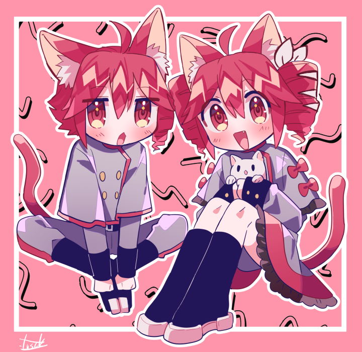 1boy 1girl :o ahoge animal animal_ears blush boots bow butterfly_sitting cat cat_ears cat_tail double-parted_bangs drill_hair fang full_body genderswap genderswap_(ftm) grey_jacket grey_pants grey_skirt hair_between_eyes hair_bow hair_ribbon hazuki_kasane holding holding_animal holding_cat invisible_floor jacket kasane_ted kasane_teto knee_boots layered_skirt own_hands_together pants red_bow red_hair red_trim ribbon sitting skirt skirt_set sleeve_cuffs smile synthesizer_v tail twin_drills utau white_bow white_ribbon yuusuke-kun