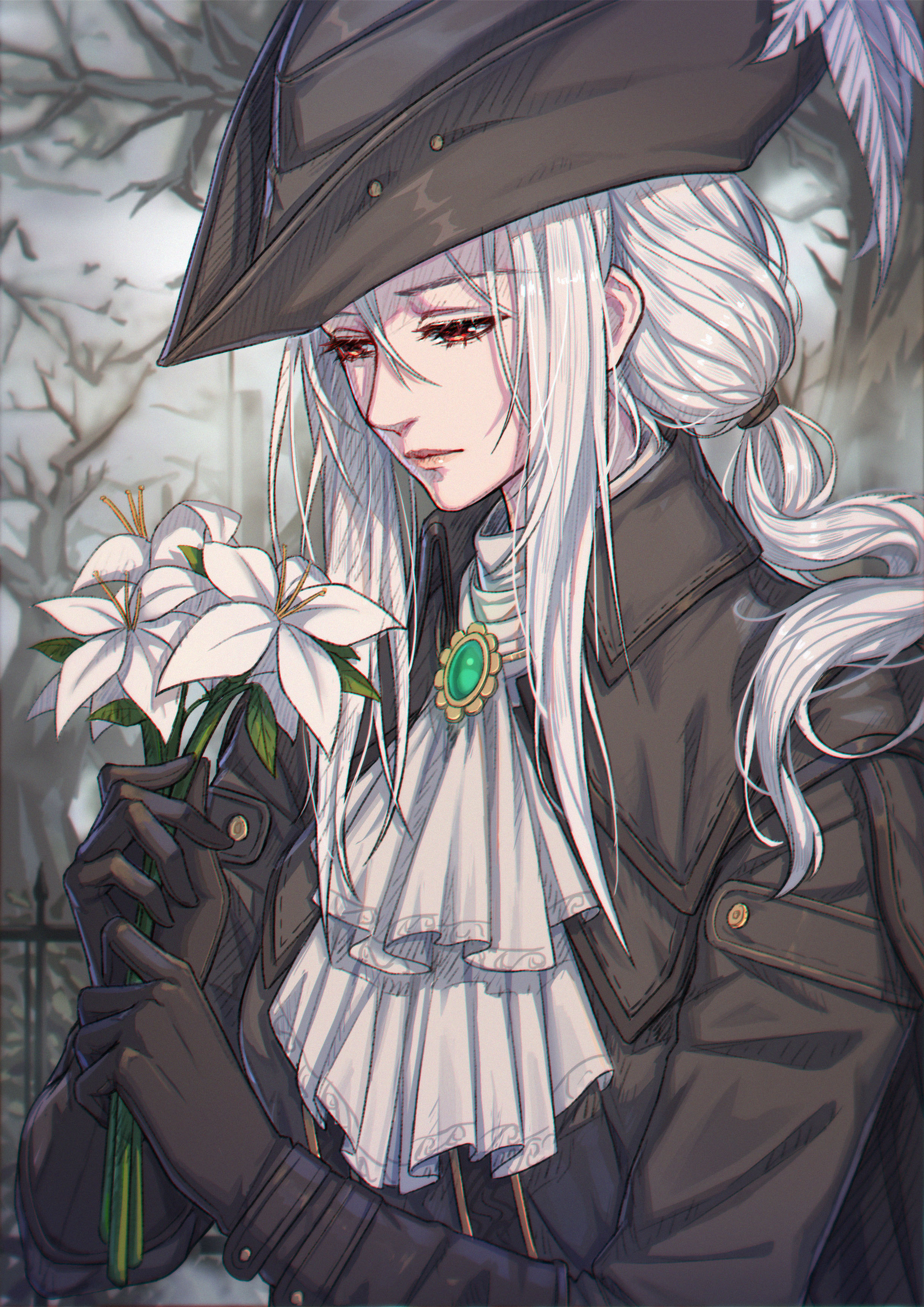 1girl absurdres ascot bloodborne cape coat flower gem gloves hat hat_feather highres holding lady_maria_of_the_astral_clocktower long_hair nairobi_song ponytail red_eyes solo white_hair