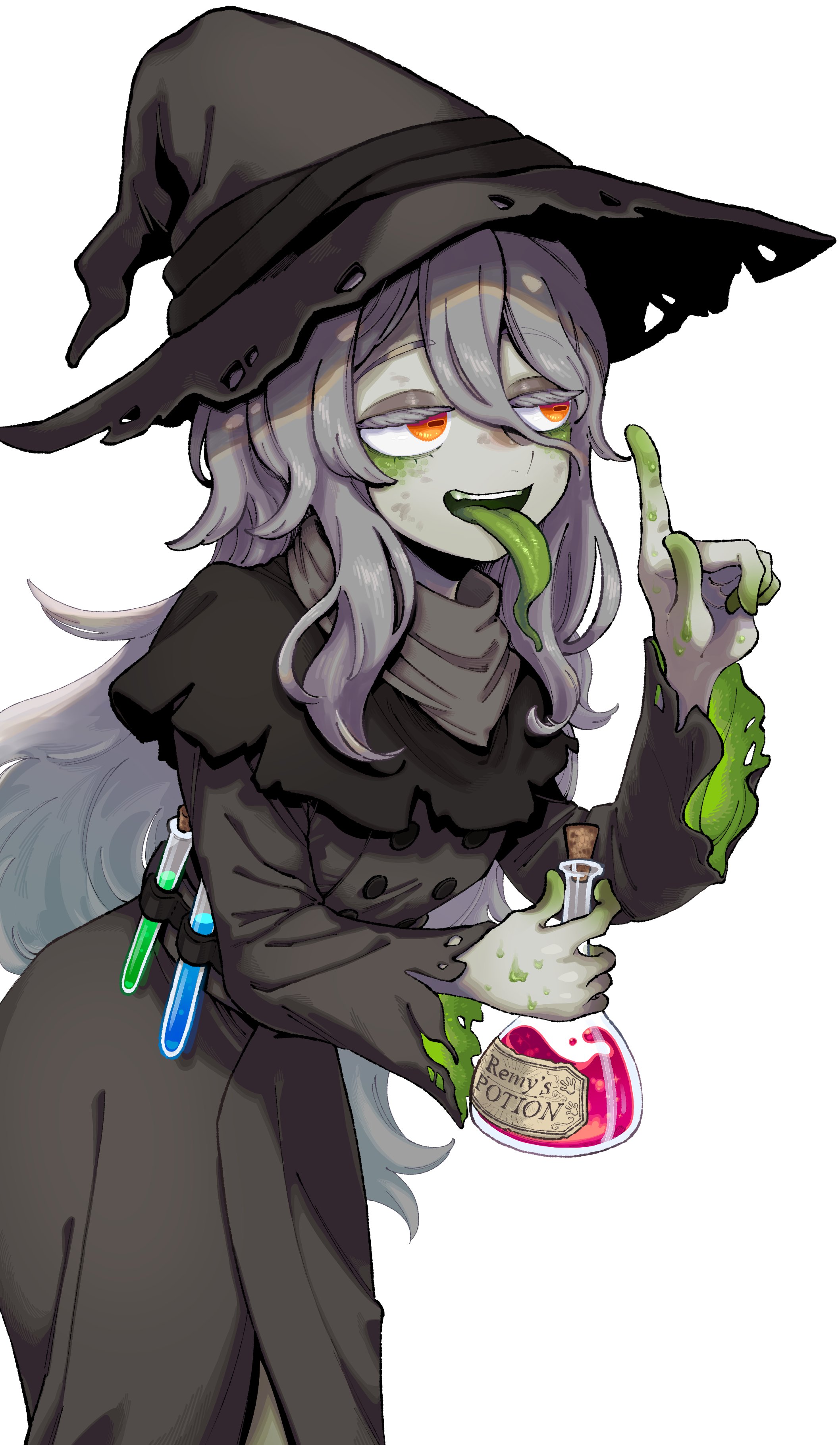 1girl absurdres black_hat colored_skin colored_tongue corked_bottle dirty dirty_face eyeshadow green_skin green_tongue grey_eyeshadow grey_hair grey_robe grey_scarf hat highres holding_potion horizon kuro_kosyou long_hair long_tongue looking_to_the_side makeup monsterification original pointing pointing_up red_eyes remy_(seihai) robe scarf simple_background slime_(substance) smile test_tube tongue tongue_out upper_body white_background