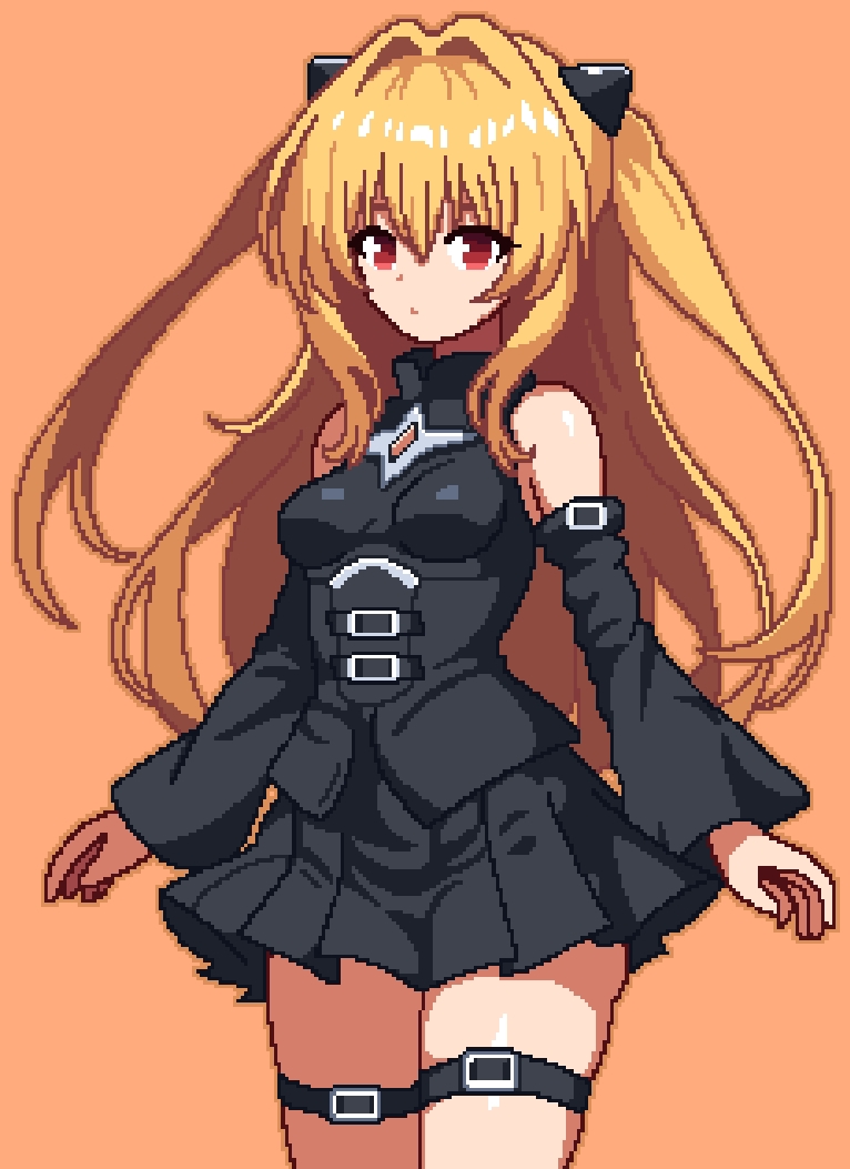 1girl a-pose bare_shoulders black_shirt black_skirt blonde_hair breasts closed_mouth commentary cowboy_shot detached_sleeves floating_hair hair_intakes konjiki_no_yami loblob_art long_hair long_sleeves looking_at_viewer miniskirt orange_background pixel_art pleated_skirt red_eyes shirt sidelocks simple_background skindentation skirt sleeveless sleeveless_shirt small_breasts solo thigh_strap to_love-ru very_long_hair wide_sleeves