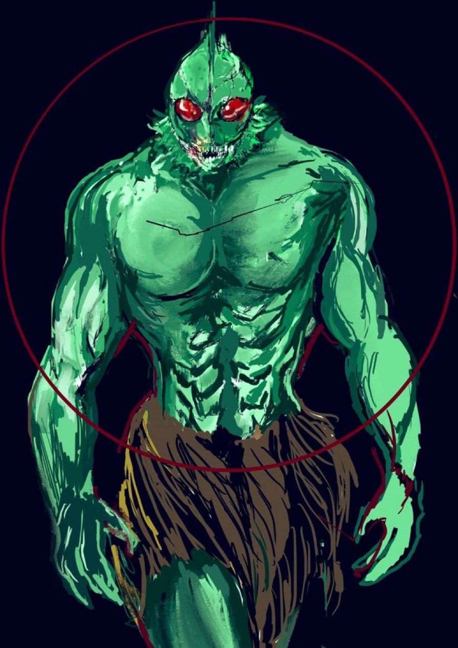 1boy abs atlantis_(kinnikuman) colored_skin fish_boy green_skin highres kinnikuman looking_at_viewer monster_boy muscular pectorals red_eyes shaded_face sharp_teeth simple_background smile teeth wrestling yoshiokanp