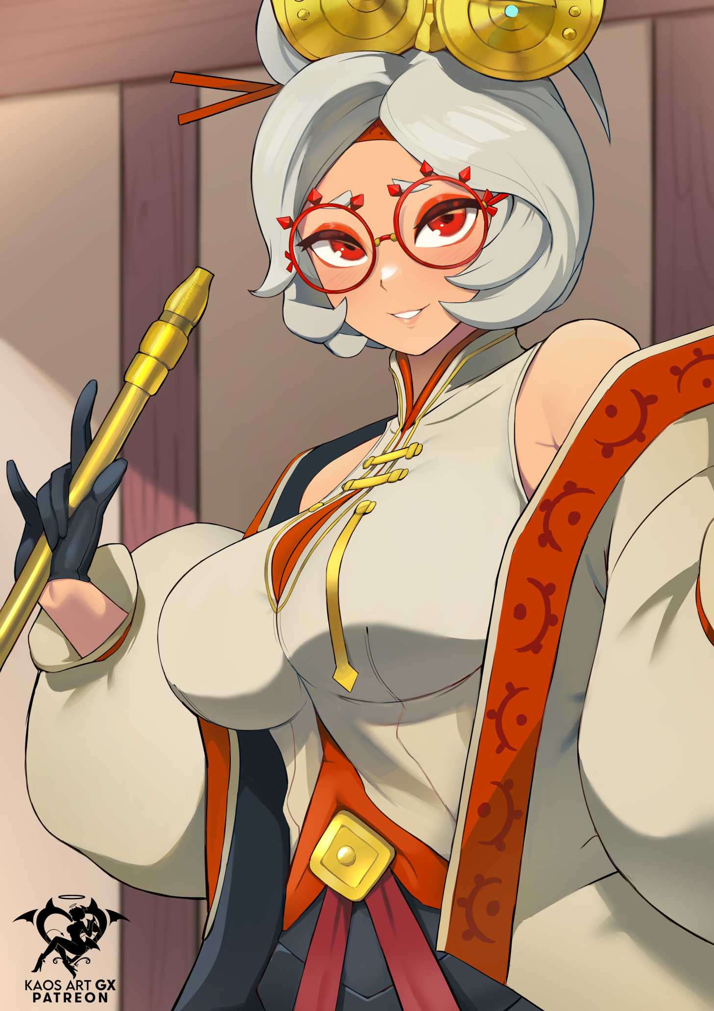 1girl artist_logo artist_name bare_shoulders belt black_gloves blush bodysuit bodysuit_under_clothes bow-shaped_hair breasts cleavage cleavage_cutout clothing_cutout coat collared_shirt detached_sleeves double_bun eyeshadow eyewear_on_head flute glasses gloves goggles goggles_on_head grey_hair hair_bun hair_ornament hair_stick half_gloves headband headgear highres holding holding_flute holding_instrument instrument kaos_art large_breasts light_blush logo long_sleeves looking_at_viewer m/ makeup nintendo open_clothes open_coat parted_lips patreon_username purah recorder red-framed_eyewear red_eyes red_eyeshadow red_ribbon ribbon sheikah shirt short_hair sidelocks sleeve_ribbon sleeveless sleeveless_shirt smile solo solo_focus the_legend_of_zelda the_legend_of_zelda:_tears_of_the_kingdom upper_body white_coat white_shirt
