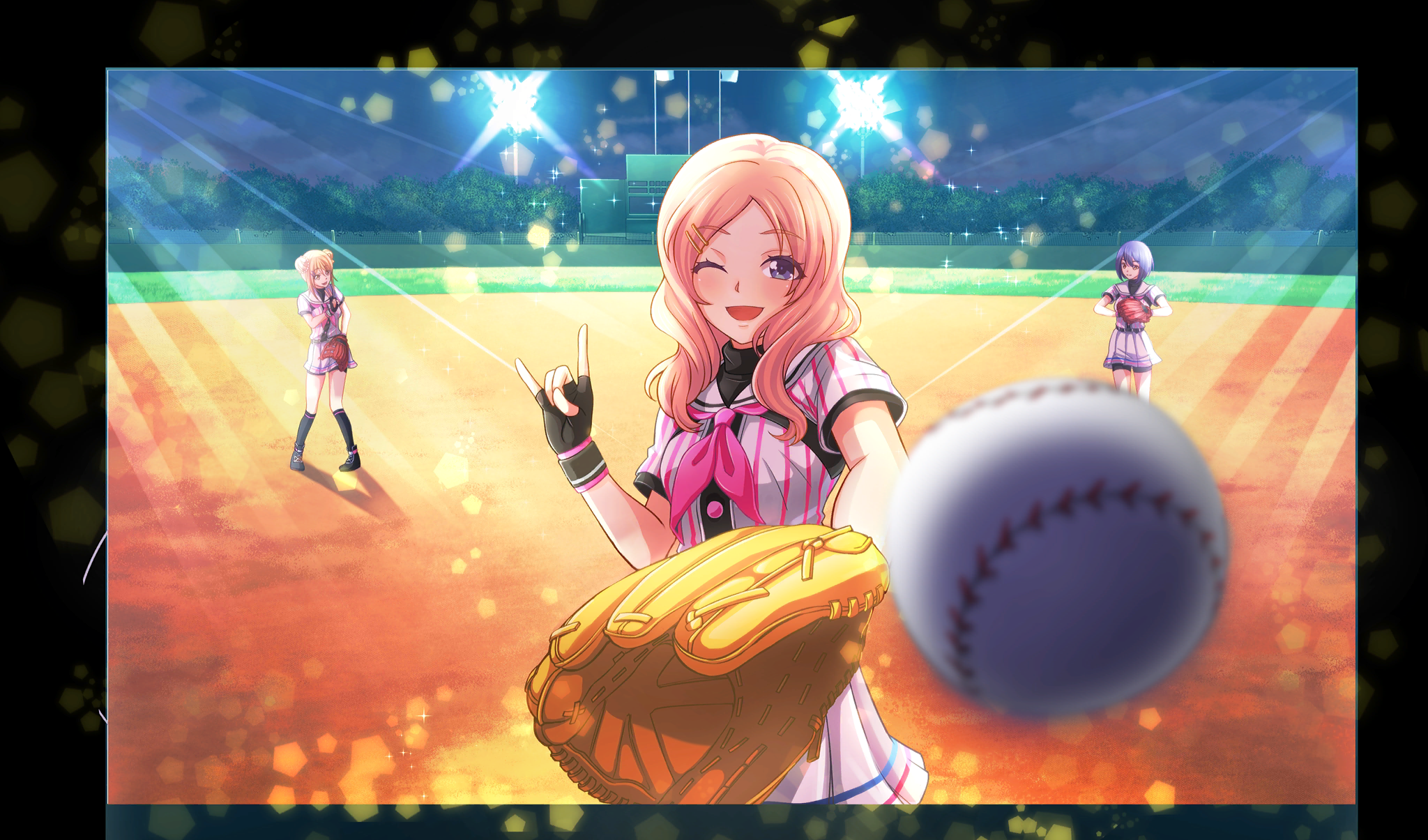 3girls ;d \n/ ball baseball baseball_(object) baseball_glove baseball_stadium baseball_uniform bike_shorts bike_shorts_under_skirt black_border black_footwear black_gloves black_shorts black_socks blurry border brown_hair catching cinderella_series depth_of_field fingerless_gloves flag game_cg glint gloves hachigatsu_no_cinderella_nine hair_ornament hairclip hanayama_emi highres lens_flare light_rays long_hair looking_at_viewer multiple_girls neckerchief night nitta_minako non-web_source official_art one_eye_closed open_mouth outdoors parted_bangs pink_hair pink_neckerchief playing_sports pleated_skirt purple_eyes purple_hair reaching reaching_towards_viewer sakagami_mei satogahama_baseball_uniform scoreboard shirt shirt_under_shirt short_hair short_sleeves shorts skirt smile socks solo_focus sparkle sportswear standing striped_clothes striped_shirt undershirt vertical-striped_clothes vertical-striped_shirt wristband