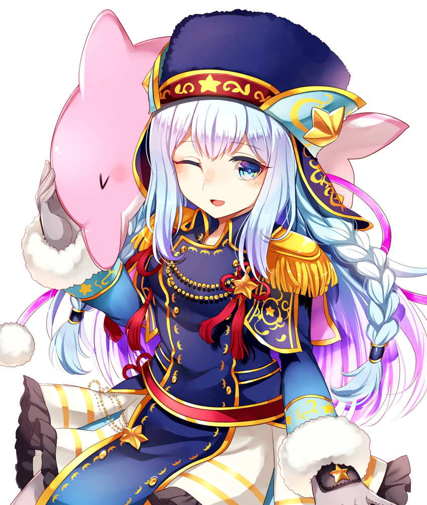 1girl braid dolphin epaulettes fur_trim gradient_eyes hat jacket long_hair long_sleeves mana_(shironeko_project) military_hat military_uniform mohuta1203 multicolored_eyes one_eye_closed open_mouth shironeko_project solo twin_braids white_hair