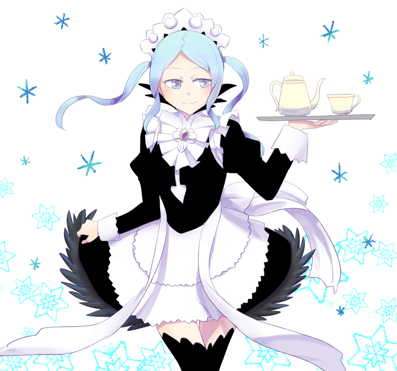 1girl apron blue_hair bridal_gauntlets cup dokoiko7 feather_trim fire_emblem fire_emblem_fates flora_(fire_emblem) frost grey_eyes holding holding_tray maid maid_apron maid_headdress nintendo teacup teapot tray twintails