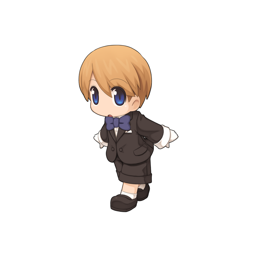 1boy :o black_jacket black_shoes black_shorts blazer blue_bow blue_bowtie blue_eyes bow bowtie chibi chibi_only child formal_clothes full_body gloves jacket light_brown_hair loafers long_sleeves looking_at_viewer male_focus official_art open_mouth ragnarok_online shirt shoes short_hair shorts simple_background socks solo standing suit transparent_background white_gloves white_shirt white_socks yuichirou zonda_novice