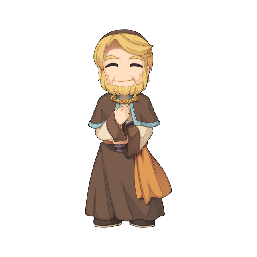 1boy :i beard blonde_facial_hair blonde_hair brown_capelet brown_hat brown_robe brown_sash capelet chibi chibi_only closed_eyes closed_mouth facial_hair father_vomars full_body hat long_sleeves male_focus official_art ragnarok_online robe shirt short_hair simple_background smile solo transparent_background white_shirt yuichirou