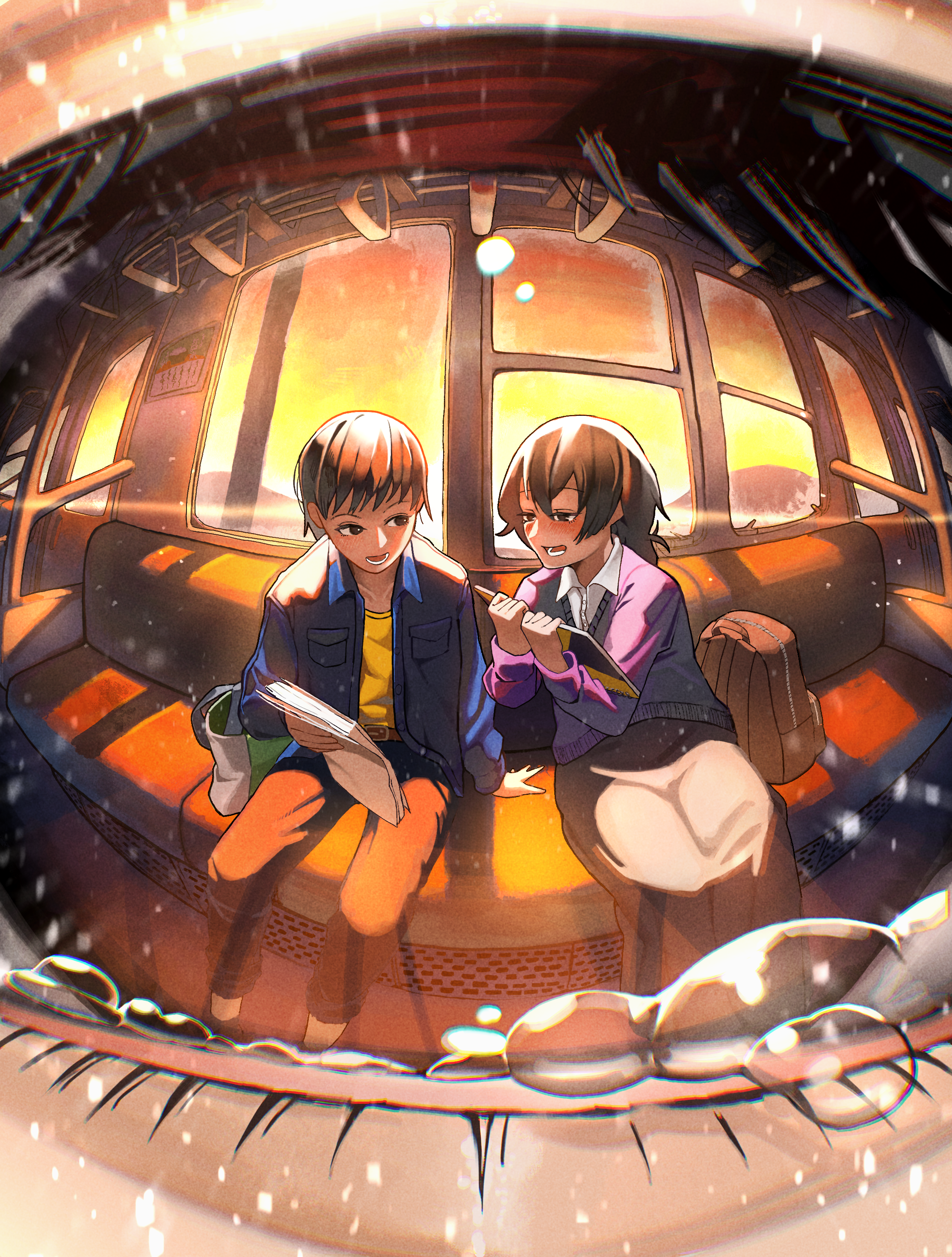 2girls :o absurdres ayumu_fujino blue_jacket close-up eye_focus eye_reflection eyelashes highres holding holding_paper holding_sketchbook jacket kyomoto_(look_back) look_back_(manga) multiple_girls paper purple_sweater reflection sitting sketchbook sunset sweater tears train_interior urapan_2525