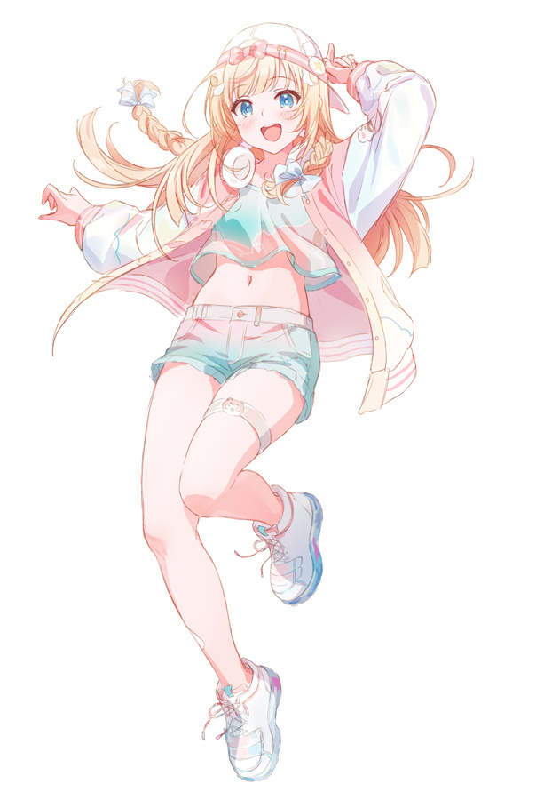 1girl backwards_hat baseball_cap blonde_hair blue_eyes braid full_body hat headphones headphones_around_neck hololive jacket kazama_iroha kazama_iroha_(street) long_hair midriff mikami_nacaba navel pink_jacket shoes shorts sneakers thigh_strap twin_braids virtual_youtuber white_background