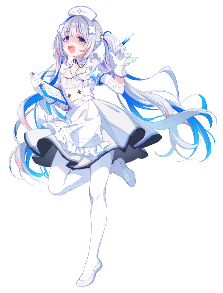 1girl amane_kanata amane_kanata_(nurse) blue_hair clipboard dress full_body gloves grey_hair hat holding holding_clipboard holding_syringe hololive long_hair mikami_nacaba multicolored_hair nurse_cap pantyhose purple_eyes shaded_face syringe twintails two-tone_hair very_long_hair virtual_youtuber white_background white_dress white_gloves white_pantyhose