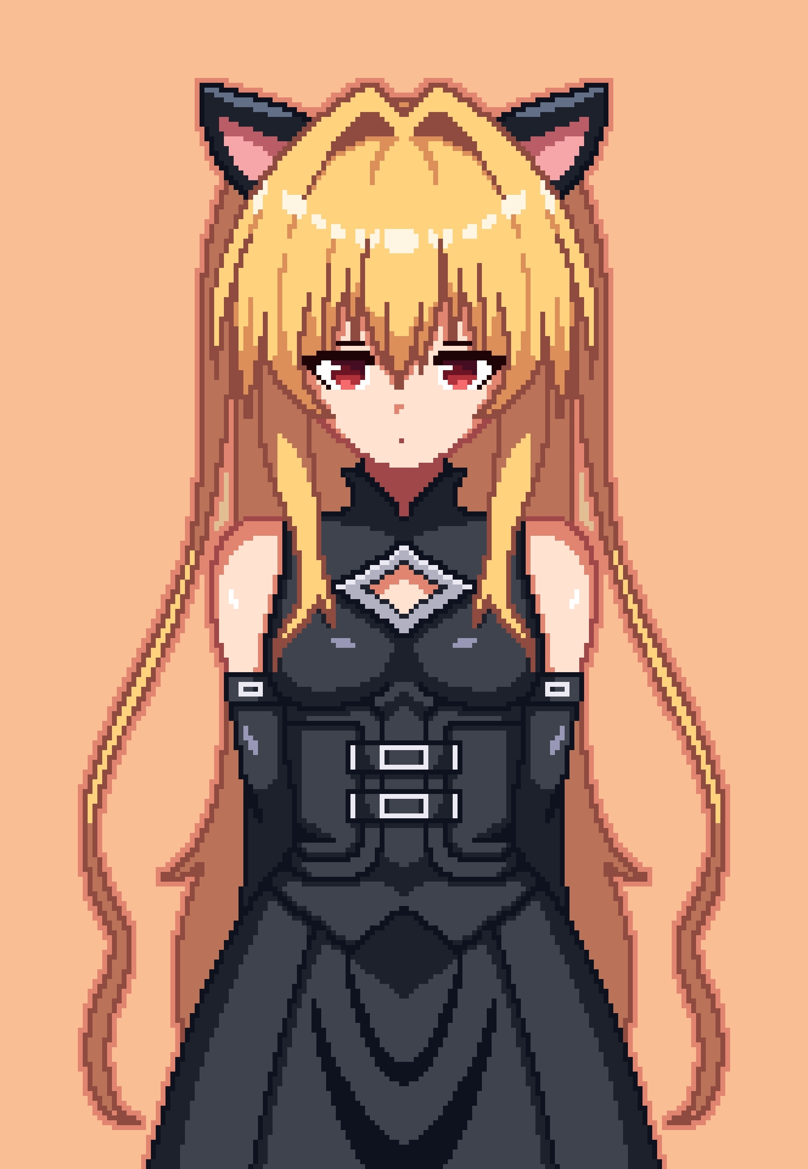 1girl absurdres animal_ears arms_behind_back bare_shoulders black_dress blonde_hair breasts cat_ears closed_mouth commentary cowboy_shot detached_sleeves dress expressionless eyes_visible_through_hair fake_animal_ears hair_between_eyes hair_intakes highres jitome konjiki_no_yami loblob_art long_hair orange_background pixel_art red_eyes sidelocks simple_background sleeveless sleeveless_dress small_breasts solo straight-on to_love-ru two_side_up very_long_hair