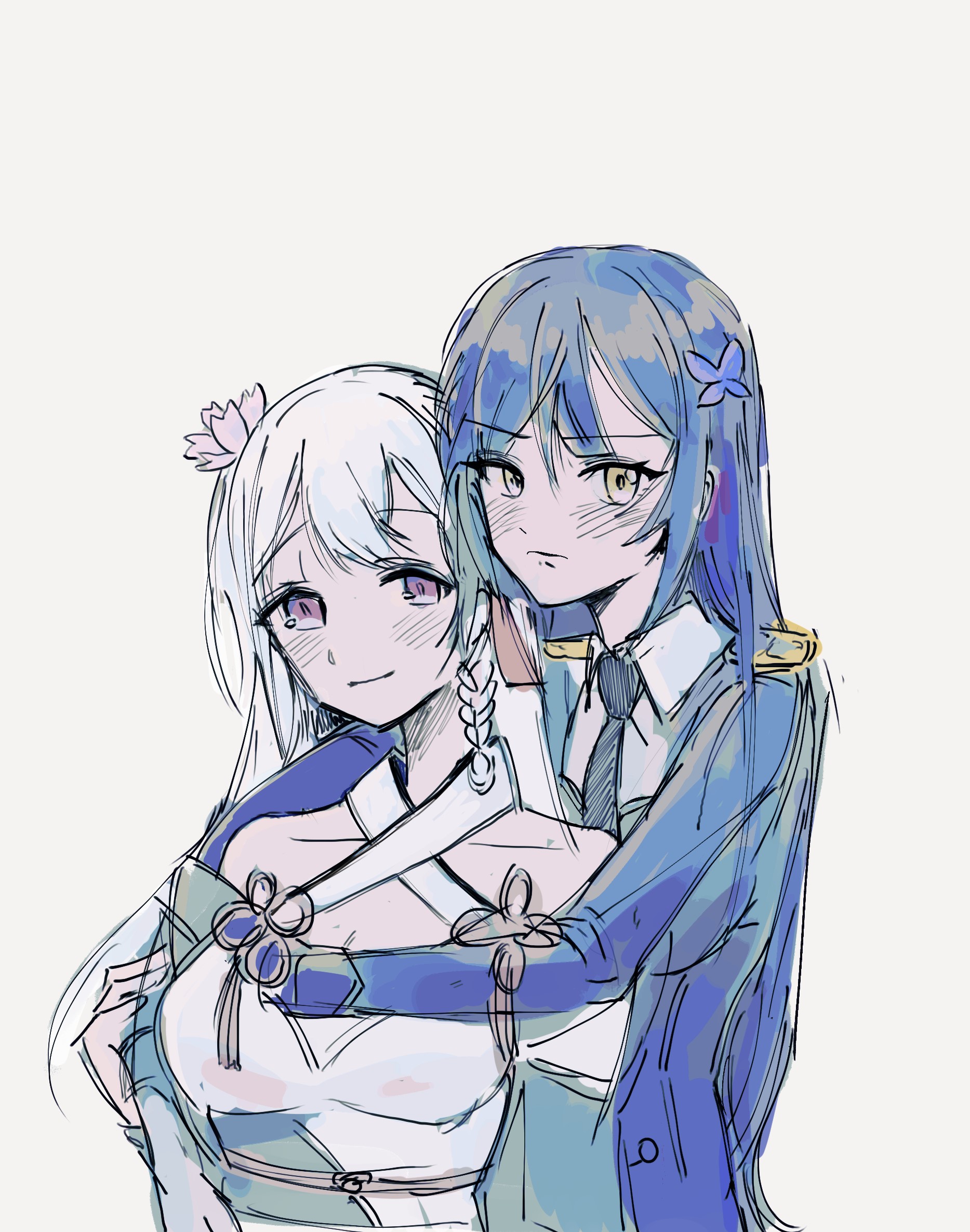 2girls arms_at_sides assault_lily bare_shoulders black_necktie blue_jacket blush braid breasts butterfly_hair_ornament closed_mouth collarbone collared_shirt commentary_request criss-cross_halter detached_sleeves epaulettes flower flower_knot funada_kiito funada_ui grey_background hair_between_eyes hair_flower hair_ornament halterneck hand_on_another's_arm hands_up heads_together highres hug hug_from_behind jacket japanese_clothes kimono korean_commentary light_smile long_hair long_sleeves looking_at_viewer medium_breasts multiple_girls necktie nn_naenn obi obijime pink_eyes pink_flower purple_hair sash shirt siblings side_braid simple_background single_braid sisters sketch tassel upper_body v-shaped_eyebrows white_hair white_kimono white_shirt yellow_eyes