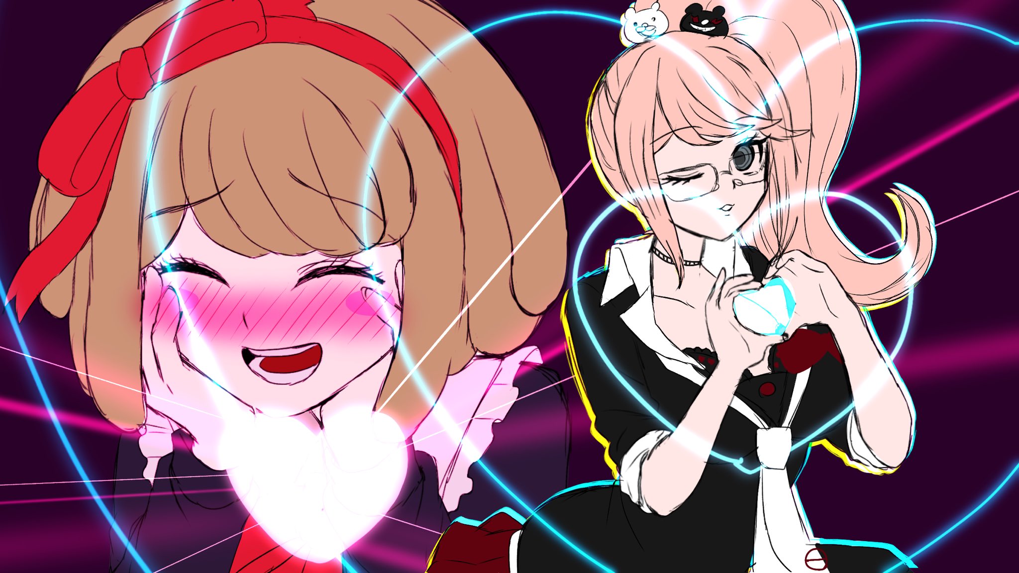 2girls :d ;d age_difference bear_hair_ornament blush blush_stickers bow breasts child cleavage danganronpa_(series) danganronpa_another_episode:_ultra_despair_girls enoshima_junko glasses green_hair hair_ornament heart heart_hands highres large_breasts long_sleeves mozuku_(iiiiiiimomo) multiple_girls necktie official_alternate_hairstyle one_eye_closed onee-loli open_mouth pink_background ponytail purple_background red_bow smile teeth tongue towa_monaca white_necktie yuri