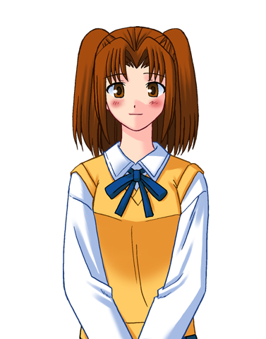 1girl blue_ribbon blue_skirt blush breasts brown_eyes brown_hair collar collared_shirt facing_viewer game_cg hair_intakes half_updo light_smile long_sleeves looking_at_viewer lowres medium_breasts medium_hair non-web_source official_art parted_bangs ribbon shirt skirt solo straight-on sweater_vest takeuchi_takashi transparent_background tsukihime twintails type-moon undershirt upper_body white_collar white_shirt white_sleeves wing_collar yellow_sweater_vest yumizuka_satsuki