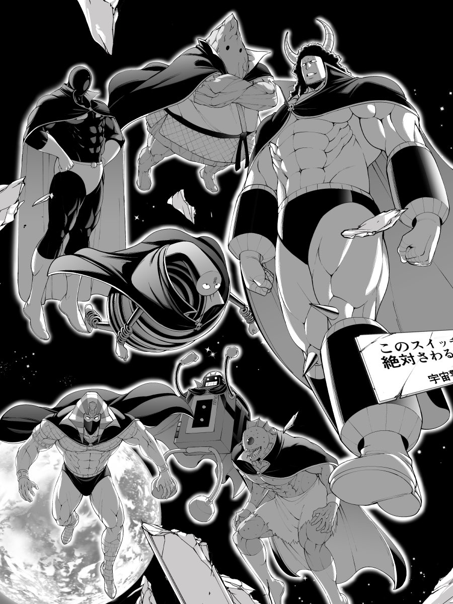 2024 6+boys android armor atlantis_(kinnikuman) attack biceps black_hole_(kinnikuman) buffaloman clenched_hands dated dougi earth_(planet) evil_smile faceless fighting_stance floating_hair greyscale_with_colored_background grin headphones highres index_finger_raised kazeya_kazuya kinnikuman large_pectorals looking_afar looking_at_viewer manly mask mister_khamen monochrome monster_boy mouth_mask multiple_boys muscular no_eyes no_mouth pectorals planet shaded_face sharp_teeth simple_background smile space spring_(object) springman_(kinnikuman) stecase_king teeth the_mountain_(kinnikuman) wrestling wrestling_outfit