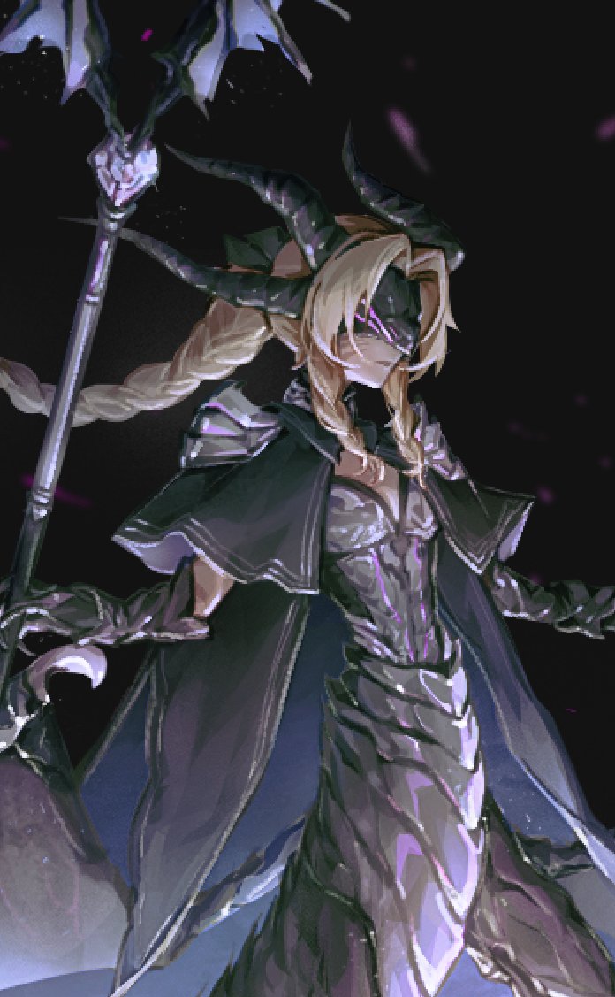 1girl aerith_gainsborough aerith_gainsborough_(bahamut_robe) armor black_background black_capelet black_gloves black_horns black_mask black_ribbon blindfold_mask braid braided_ponytail breasts brown_hair capelet covered_eyes cowboy_shot dragon_girl dragon_horns eye_mask facial_mark final_fantasy final_fantasy_vii final_fantasy_vii:_ever_crisis gloves hair_ribbon holding holding_staff horns lily_(shio1006) long_hair mask medium_breasts official_alternate_costume parted_bangs prototype_design ribbon shoulder_armor sidelocks single_braid solo staff
