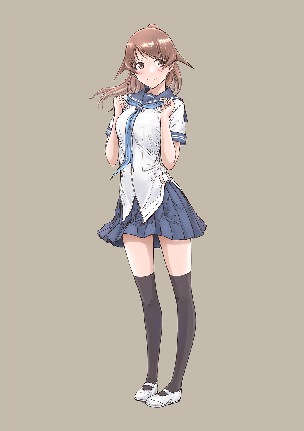 1girl black_thighhighs blue_necktie blue_sailor_collar blue_skirt blush brown_background brown_eyes brown_hair closed_mouth collared_shirt dress_shirt floating_hair full_body highres kisaragi_gunma loafers long_hair looking_to_the_side necktie original pleated_skirt sailor_collar sailor_shirt school_uniform serafuku shirt shoes short_sleeves simple_background skirt smile solo standing swept_bangs thighhighs white_shirt white_shoes zettai_ryouiki