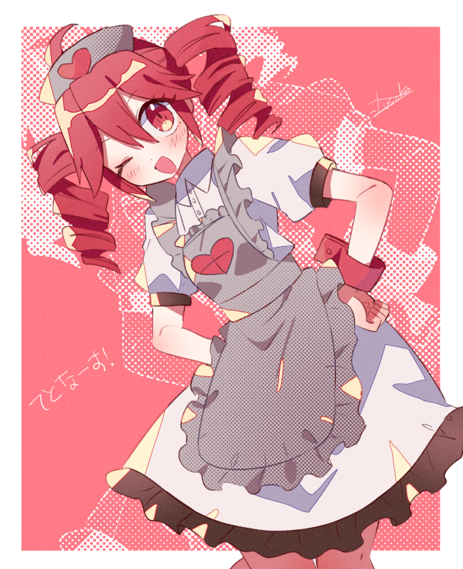 1girl alternate_costume apron buttons collared_dress cowboy_shot double-parted_bangs dress drill_hair frilled_apron frills grey_apron grey_hat hair_between_eyes hands_on_own_hips hat heart heart_print kasane_teto layered_dress medium_skirt nurse nurse_cap open_mouth print_headwear red_apron red_eyes red_hair red_wrist_cuffs signature skirt solo striped_apron striped_clothes tongue twin_drills utau white_dress wing_collar wrist_cuffs yuusuke-kun