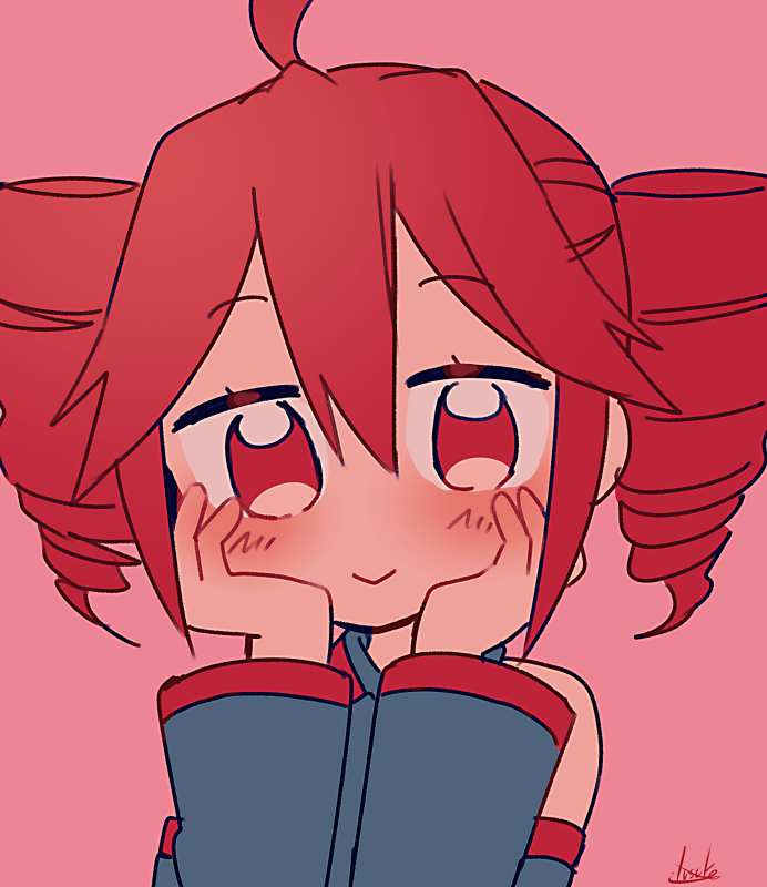 1girl ahoge black_shirt black_sleeves blush collared_shirt detached_sleeves double-parted_bangs drill_hair hair_between_eyes hands_on_own_cheeks hands_on_own_face hands_up kasane_teto kasane_teto_(utau) long_sleeves pink_background red_eyes red_hair shirt signature sleeveless sleeveless_shirt smile solo twin_drills utau yuusuke-kun