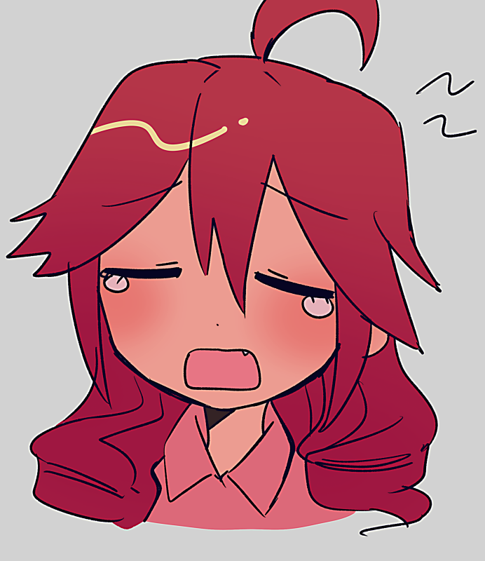 1girl ahoge alternate_hairstyle blush close-up collared_shirt double-parted_bangs drill_hair fang grey_background hair_between_eyes kasane_teto open_mouth pink_skirt red_hair shirt simple_background skirt sleepy solo tears utau wing_collar yuusuke-kun